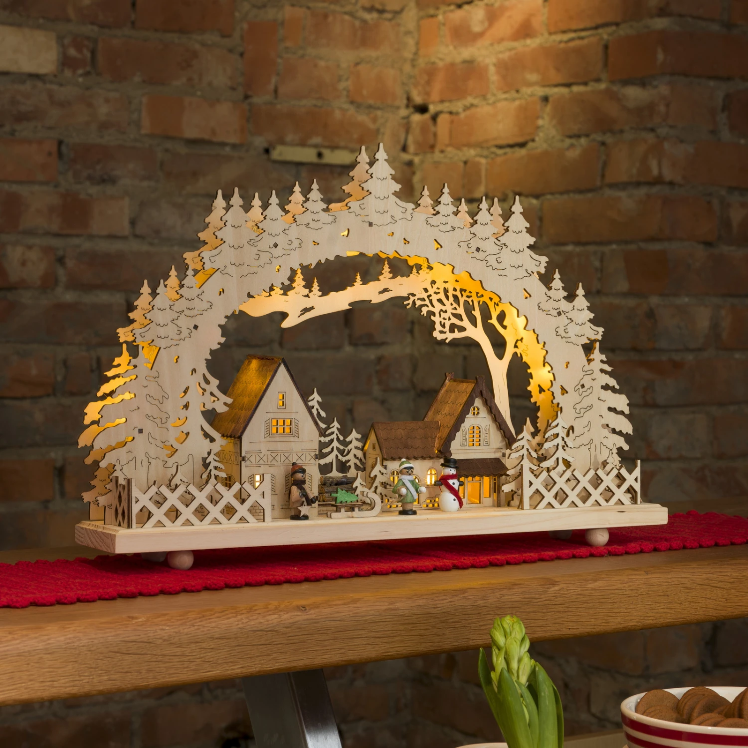 Mit diesem schönen Lichterbogen im Fenster entsteht zum einen eine gemütliche Atmosphäre im Raum, zum anderen wirkt das Haus – von außen betrachtet – besonders behaglich und einladend. Die Dorfszene aus naturfarbenem Holz wird von 10 LEDs mit warmweißem Licht in Szene gesetzt. Funktion wahlweise mit Trafo oder Batterie. Batterie nicht im Lieferumfang enthalten.