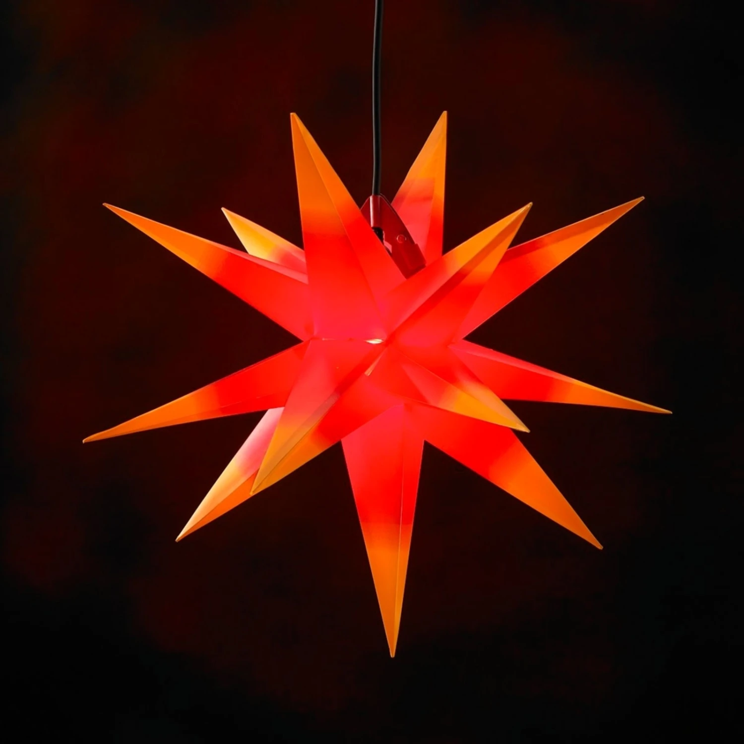 Dieser große Kunststoff-Stern vereint alles, was ein attraktives Deko-Accessoire ausmacht: anspruchsvolles Design, gepaart mit schöner Form- und Farbgebung. Zudem ist der 18-zackige Stern mit der Schutzart IP44 ausgestattet, was ihn gegen Spritzwasser schützt und eine Verwendung im Außenbereich – z. B. an der Außenseite der Fenster sowie auf dem Balkon oder der Terrasse – unkompliziert macht. Aufgrund des Durchmessers von 60 cm ist diese schöne, vorweihnachtliche Dekoration nicht zu übersehen.