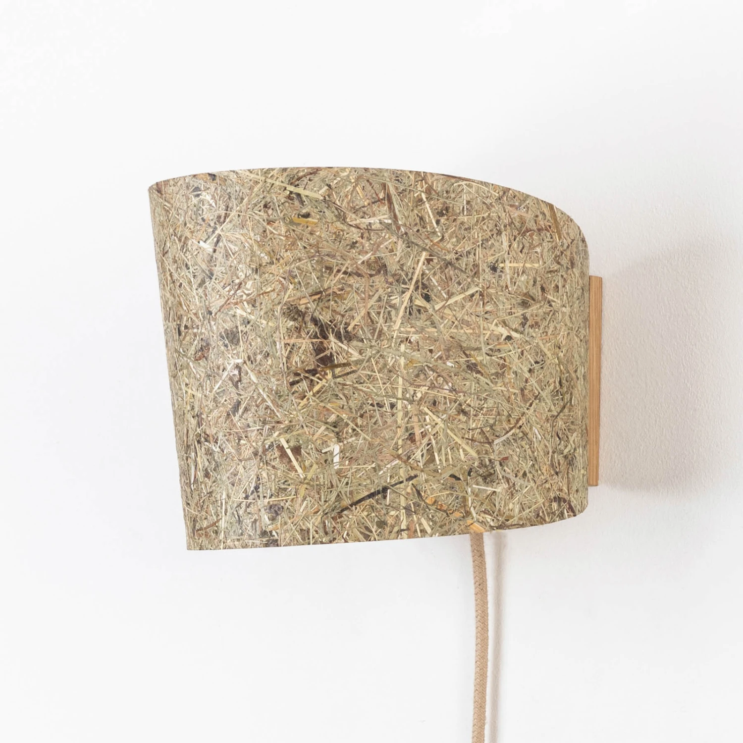 Mit der Wandleuchte aus der Designlinie 1411 wird hält die Idylle der Tiroler Alpen in den Wohnraum Einzug. Der zylindrisch gestaltete Leuchtenschirm ist mit aus echtem Heu belegt. Die Leuchte besteht vollständig aus natürlichen Materialien; so ist die Wandbefestigung aus Eichenholz gearbeitet, das Kabel mit Stecker und Schalter verfügt über eine Ummantelung aus Jutetextil. Die Herstellung dieser Leuchte des österreichischen Startups Almut von Wildheim erfolgt in Europa. Dabei kommen keinerlei tierische Erzeugnisse zum Einsatz – das Ergebnis ist ein veganer und nachhaltiger Lichtspender.