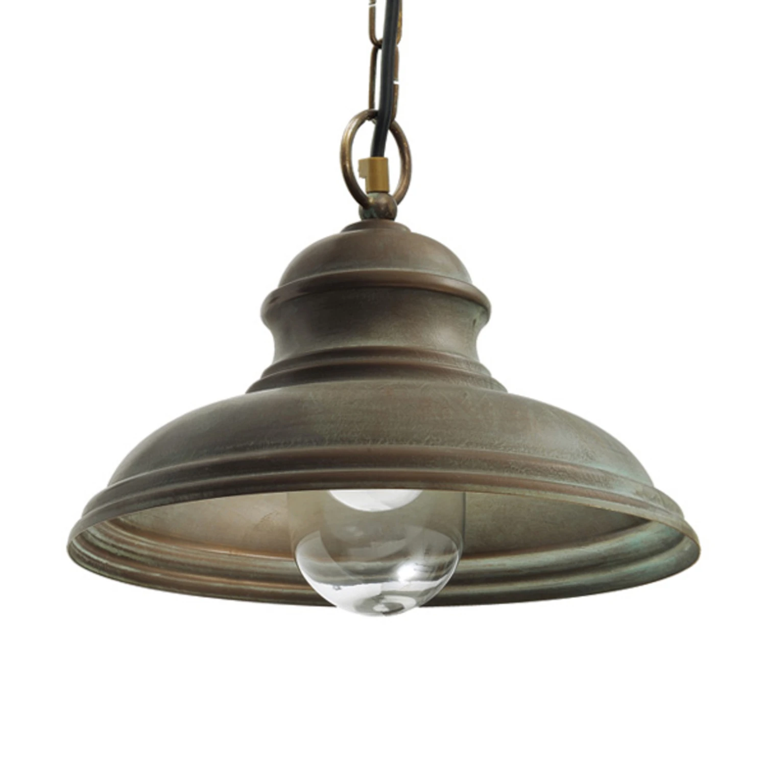 Die Hängeleuchte Riccardo überzeugt durch ihre hochwertige Verarbeitungsweise und dekorative Optik. Sie besteht komplett aus Messing und setzt sich aus einem runden Baldachin, einer stabilen Kettenabhängung und einem daran befestigten Leuchtenschirm zusammen. Das Messing wirkt aufgrund der patinierten Oberfläche wunderbar alt und abgenutzt, so dass die Leuchte eine besonders nostalgische Wirkung erzielt. Das Licht wird durch die nach unten gerichtete, ausladende Schirmform weiträumig ausgestrahlt.