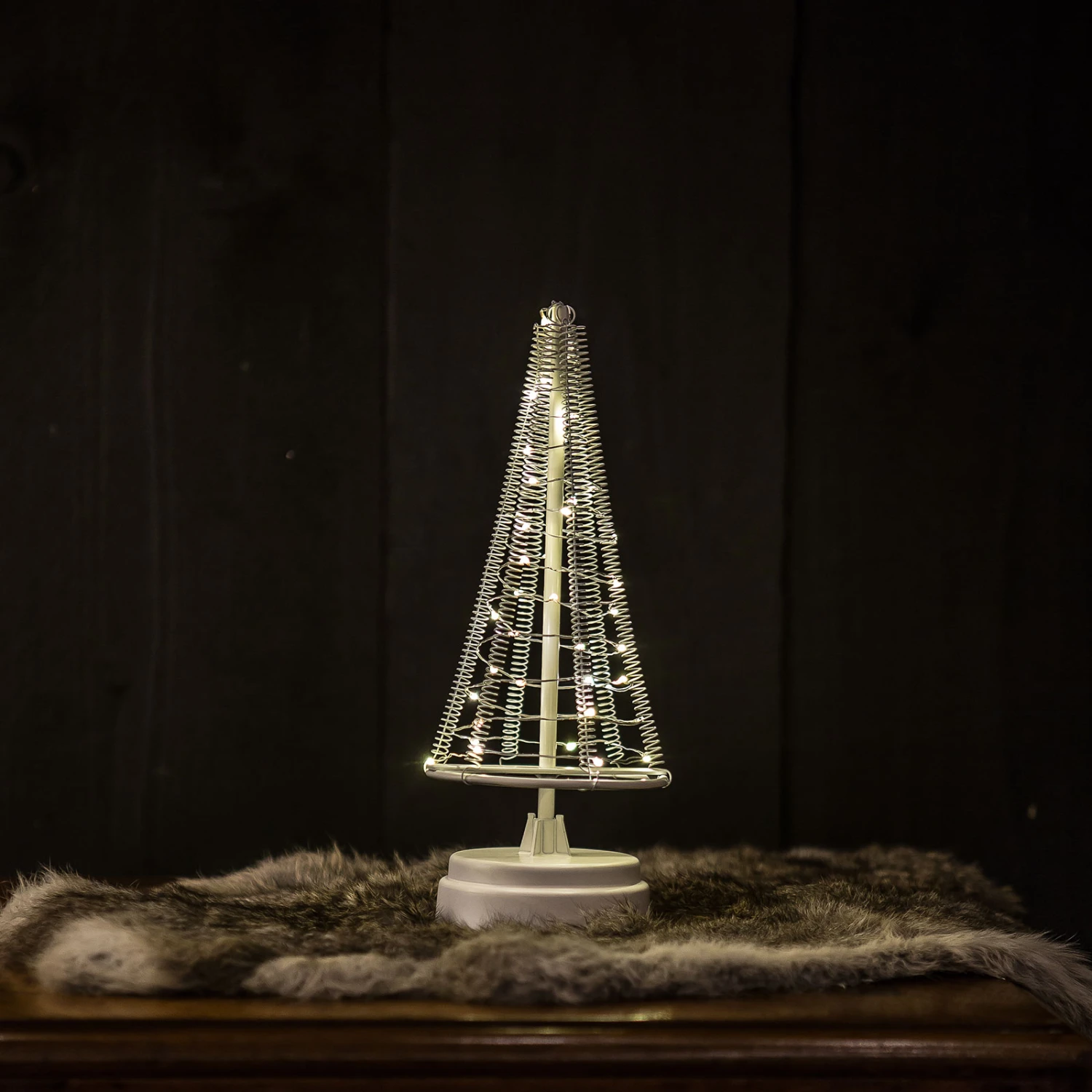 Santa’s Tree ist ein flexibel platzierbarer, weißer LED-Dekorationsbaum, der an vielen Stellen im Innenbereich als weihnachtliche Beschmückung eine hervorragende Figur macht. Der aus Metall und Kunststoff gefertigte Aufbau mit rundem Ständer, Stab, unterem Haltering und dazwischen gespannten Drahtfedern ist simpel, aber effektiv. Die LEDs, welche ein warmweißes Licht ausstrahlen, sind auf einem ringsum geführten silbernen Kabel platziert.