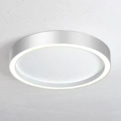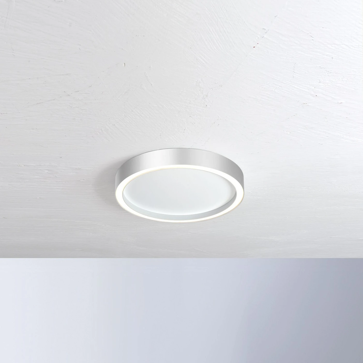 In Ringform präsentiert sich die LED-Deckenleuchte Aura. Die beiden Metallringe, die die satinierte Abdeckung der LEDs einrahmen, bestehen aus lackiertem Aluminium. Sie umgeben das warmweiß leuchtende LED-Band, das durch die satinierte Abdeckung sehr gleichmäßig strahlt und auch durch einen schmalen Spalt zwischen dem inneren Ring und der Leuchtenmitte dringt ein Lichtschein hindurch, der für einen schönen Effekt sorgt. Die Leuchte ist dimmbar (Triac, Dimmer nicht enthalten).