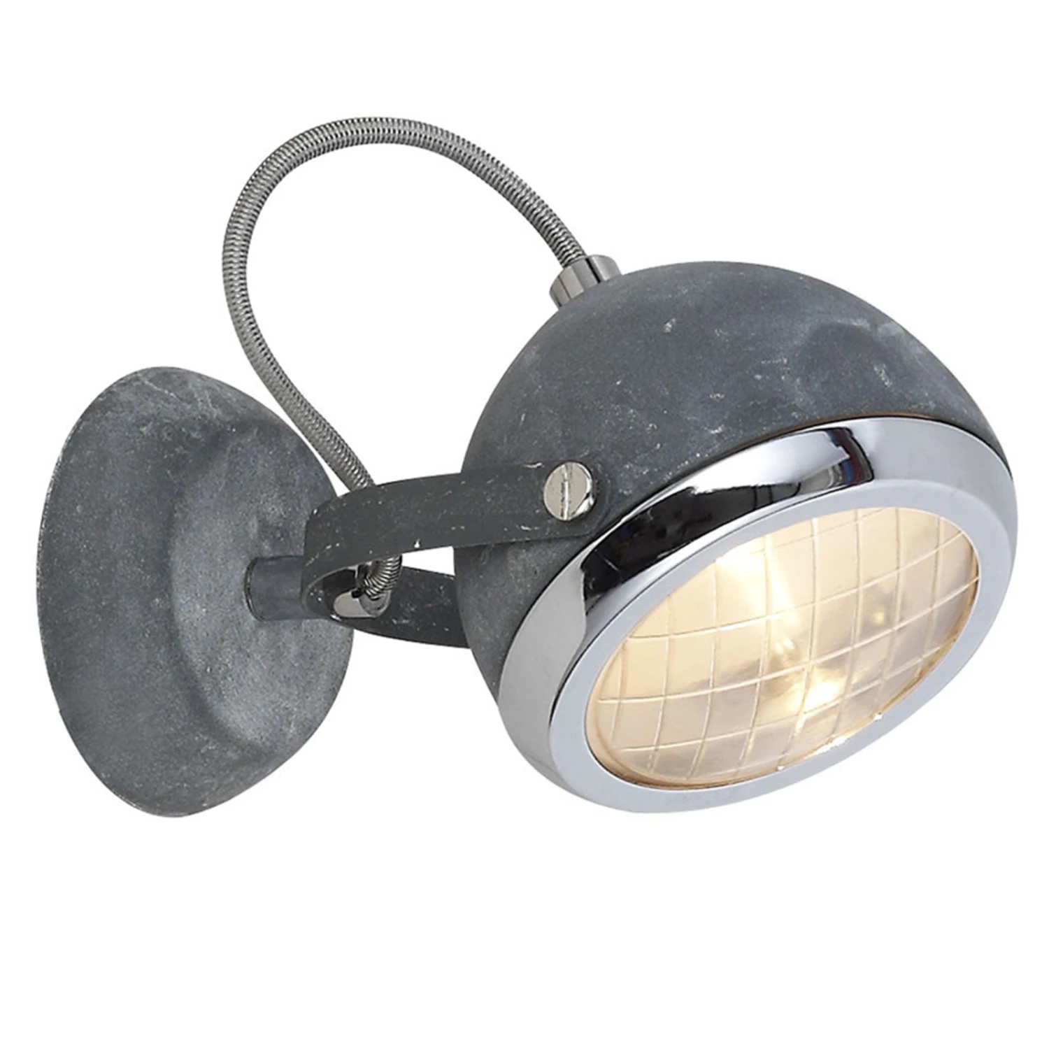 Wie ein Scheinwerfer wurde die schicke Wandleuchte Rider gestaltet, die sich an der runden Wandhalterung drehen lässt. Der runde Leuchtenkopf kann zusätzlich in seinem Haltebügel geschwenkt werden. Die Metallteile der Wandleuchte wurden in Betonoptik gestaltet, wohingegen der Rand um den Strahler glänzend verchromt wurde.