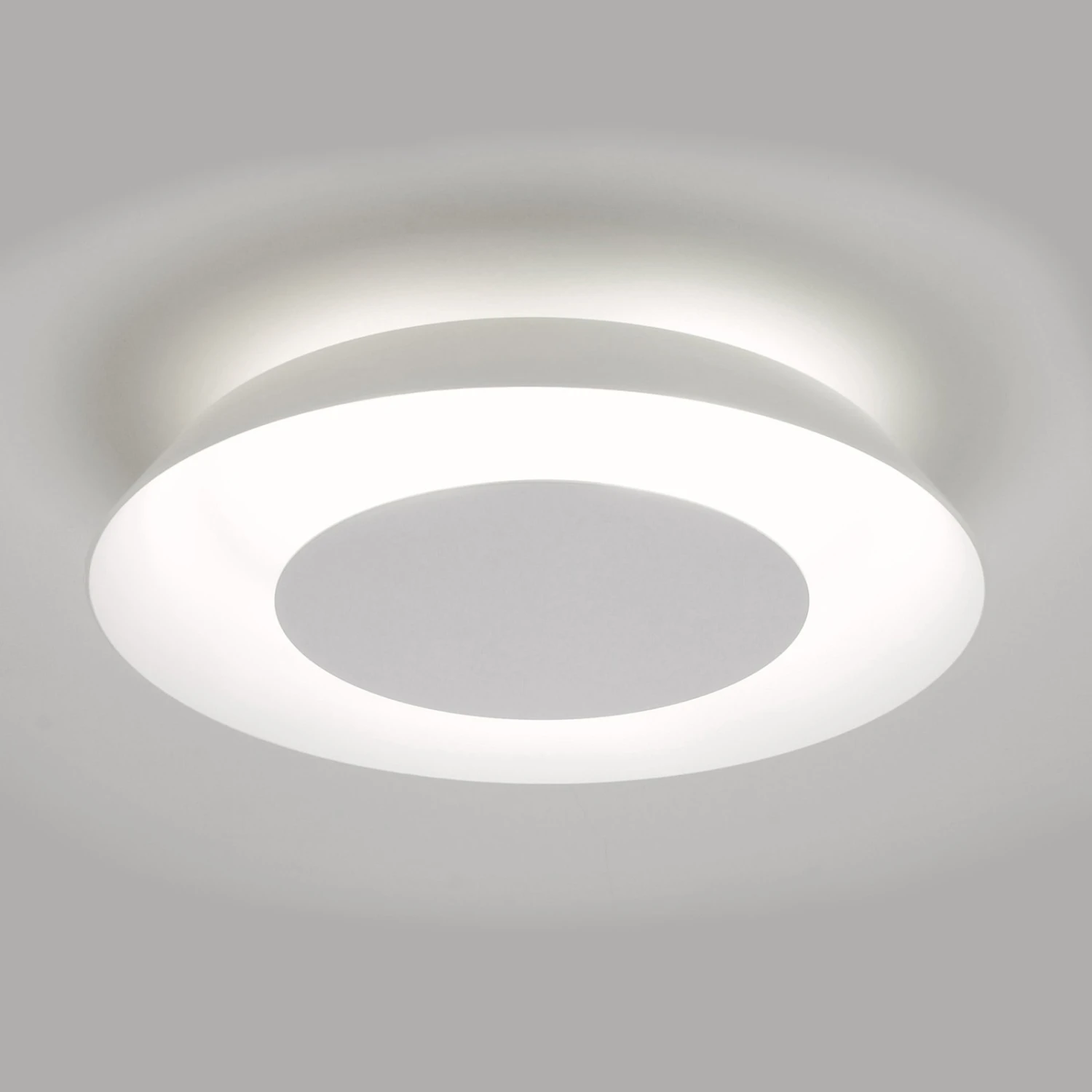Die runde Deckenleuchte Torno überzeugt mit modernem Design und angenehmer Lichtwirkung. Ihr flacher, nach unten ausgerichteter Diffusor aus mattem Glas, der für eine gleichmäßige Lichtbrechung sorgt, wird von einem zentralen Kreis und einem rückseitigen Rahmen aus matt-weißem Aluminium gehalten. Durch eine rückseitige Öffnung wird zudem der unmittelbar angrenzende Bereich der Decke erhellt. Die in Deutschland gefertigte Deckenleuchte Torno bietet eine sehr gute Farbwiedergabe und kann über externe Dimmer im Lichtoutput geregelt werden.