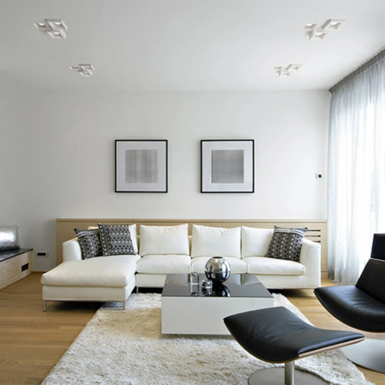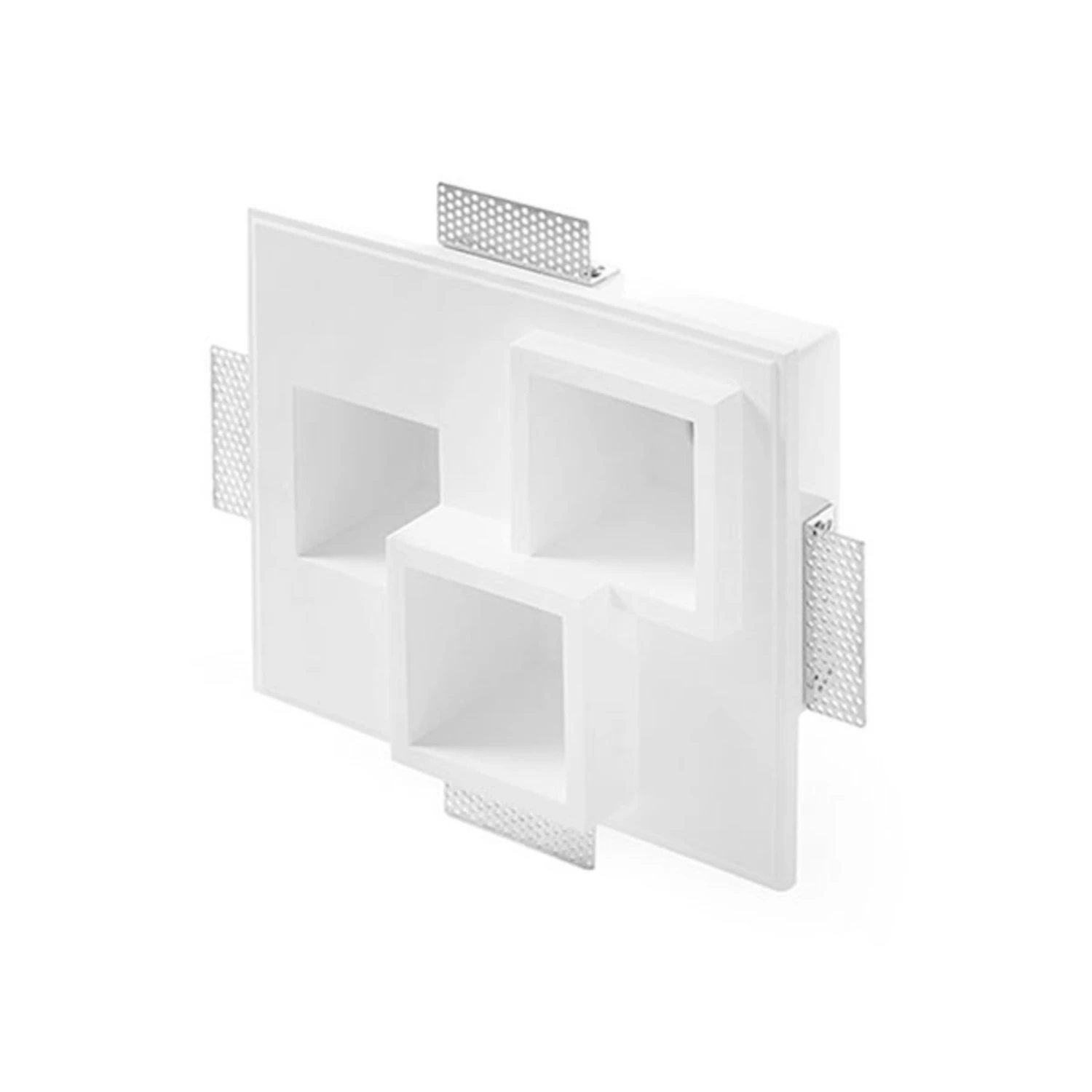 Der Einbaustrahler Heraea verschwindet dank seiner Beschaffenheit bündig in einer Gipskartondecke und lässt sich leicht überstreichen, denn das Gehäuse des Einbaustrahlers ist ebenfalls aus Gips geformt. Die quadratischen Aussparungen, in denen sich jeweils eine GU10-Fassung befindet, sind in die Decke eingelassen, sodass die Leuchtmittel scheinbar in der Decke verschwinden. Das Zusammenspiel aus hervorstehenden und eingelassenen Quadraten wertet den Raum auf und gibt sowohl der Decke als auch einer Wand eine tolle Struktur und klare Formen.