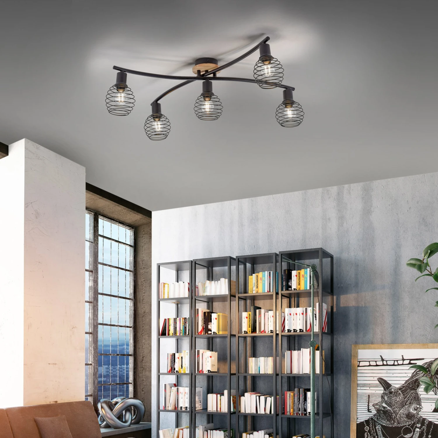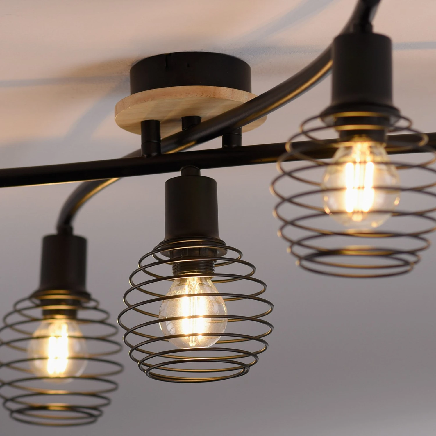 Die Deckenleuchte Eugen stellt aufgrund ihrer schwungvoll ausgeführten Form sowie des farblichen Kontrastes einen auffälligen Blickfang im Raum dar. Die käfigartigen Schirme geben den Blick auf die eingesetzten Leuchtmittel frei. Es empfiehlt sich deshalb, für die weitere Aufwertung der Optik dekorative Filamentleuchtmittel zu verwenden, wie sie über das Zubehör erhältlich sind. Das Holzdekor verleiht der Deckenleuchte Eugen noch natürliches Flair.