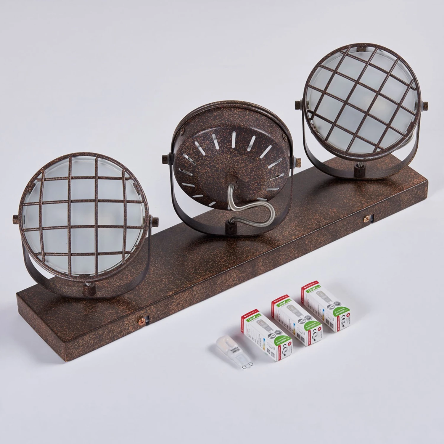 Tamin ist mit G9-LED-Lampen ausgestattet, die zum einen energiesparend sind und zum anderen über einen externen Dimmer in der Helligkeit variiert werden können. Optisch vereint die LED-Deckenlampe einen industriellen Charakter mit einer antiken Note. Dabei rührt der industrielle Charme in erster Linie von den Gitterabdeckungen, während das Rostfinish nicht nur täuschend echt erscheint, sondern auch beim Betrachter für Nostalgie sorgt, weil man glaubt, eine Leuchte vor sich zu haben, die schon ein paar Jahrzehnte Lebenszeit zu verbuchen hat.