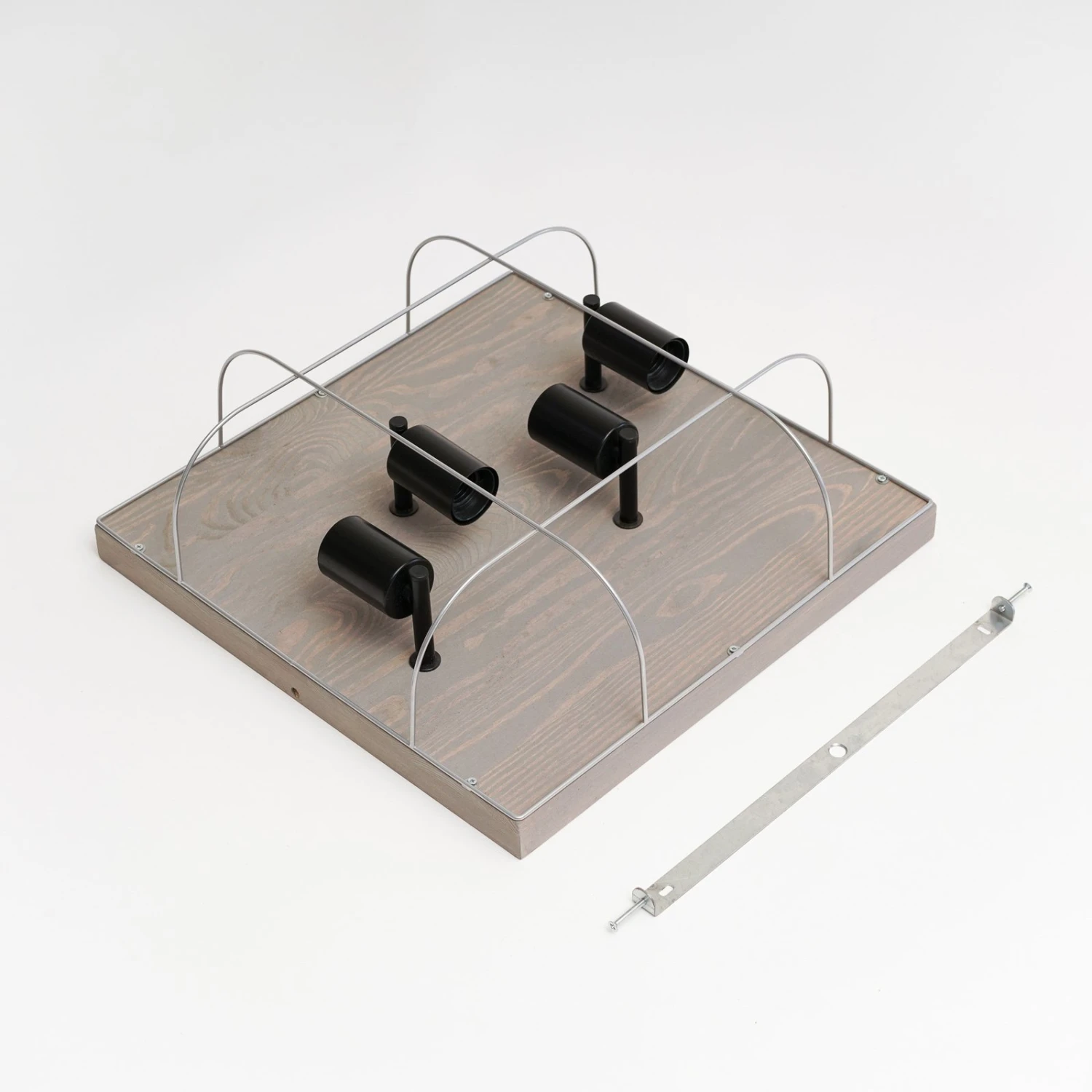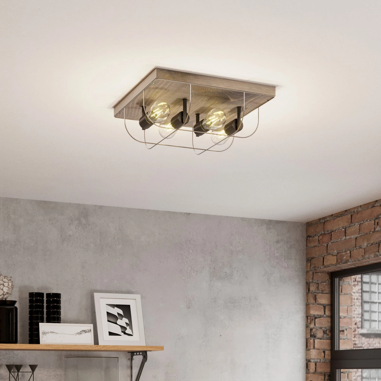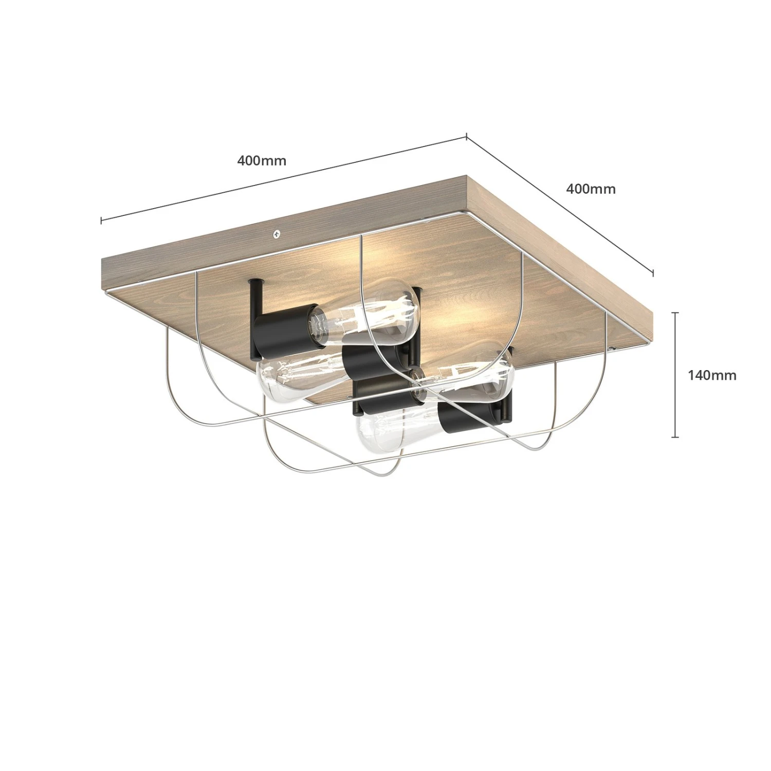 Die Deckenleuchte Neptuna verfügt über eine quadratische Kiefernholzplatte auf der vier schwarze Leuchtmittelfassungen befestigt sind. Diese werden von einem zierlichen, halbrunden Metallrahmen umspannt. Durch die harmonische und unaufdringliche Gestaltung fügt sich die Deckenleuchte gut in verschiedene Umgebungen ein und wertet zum Beispiel den Flurbereich, das Wohn- oder Schlafzimmer auf.