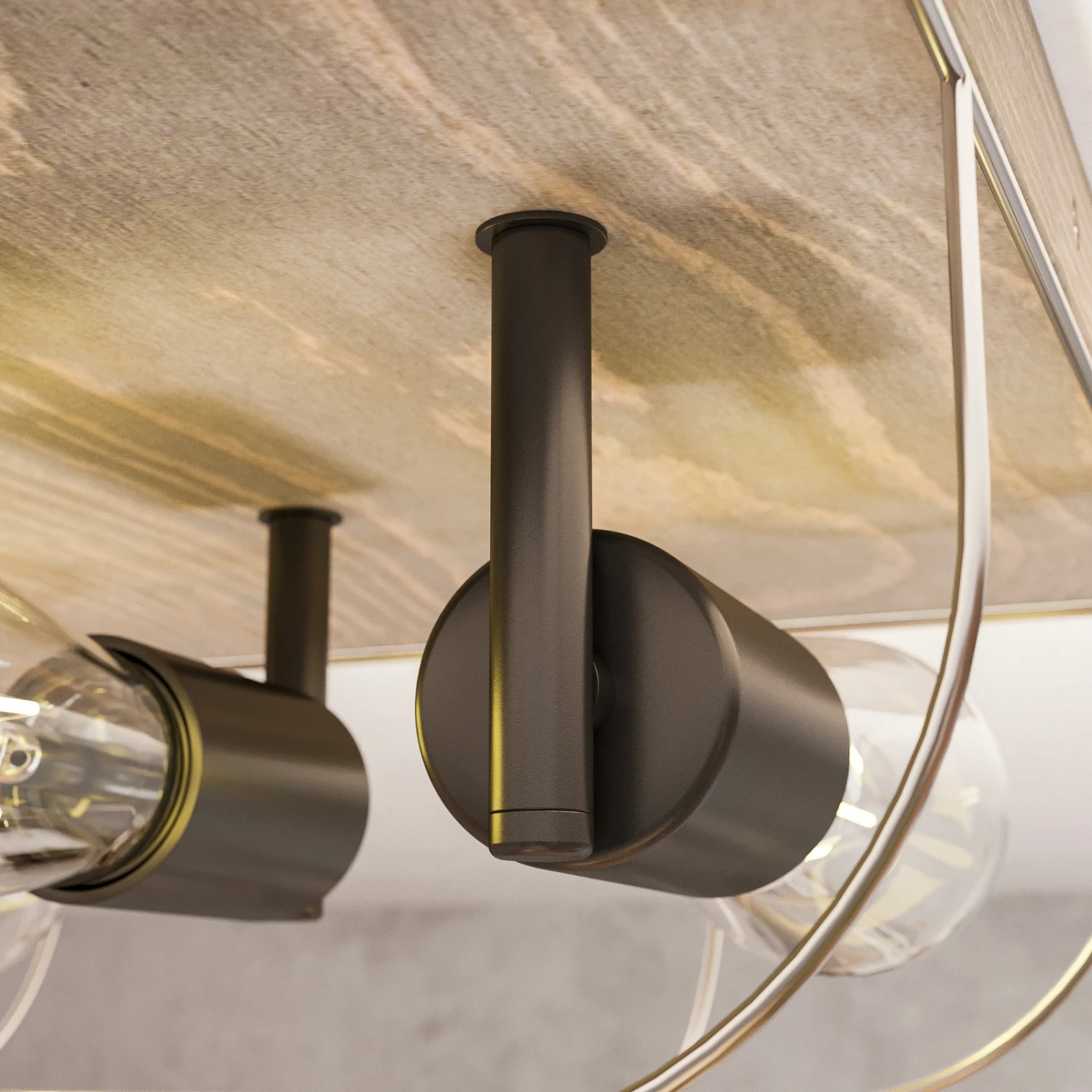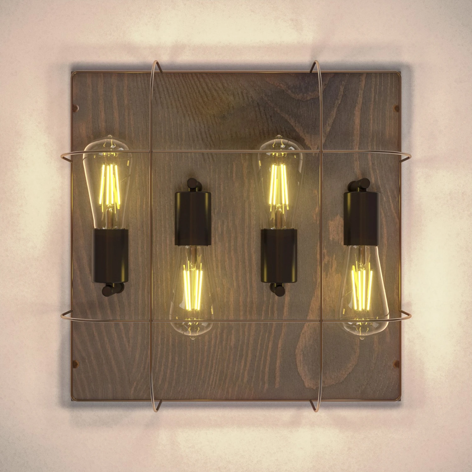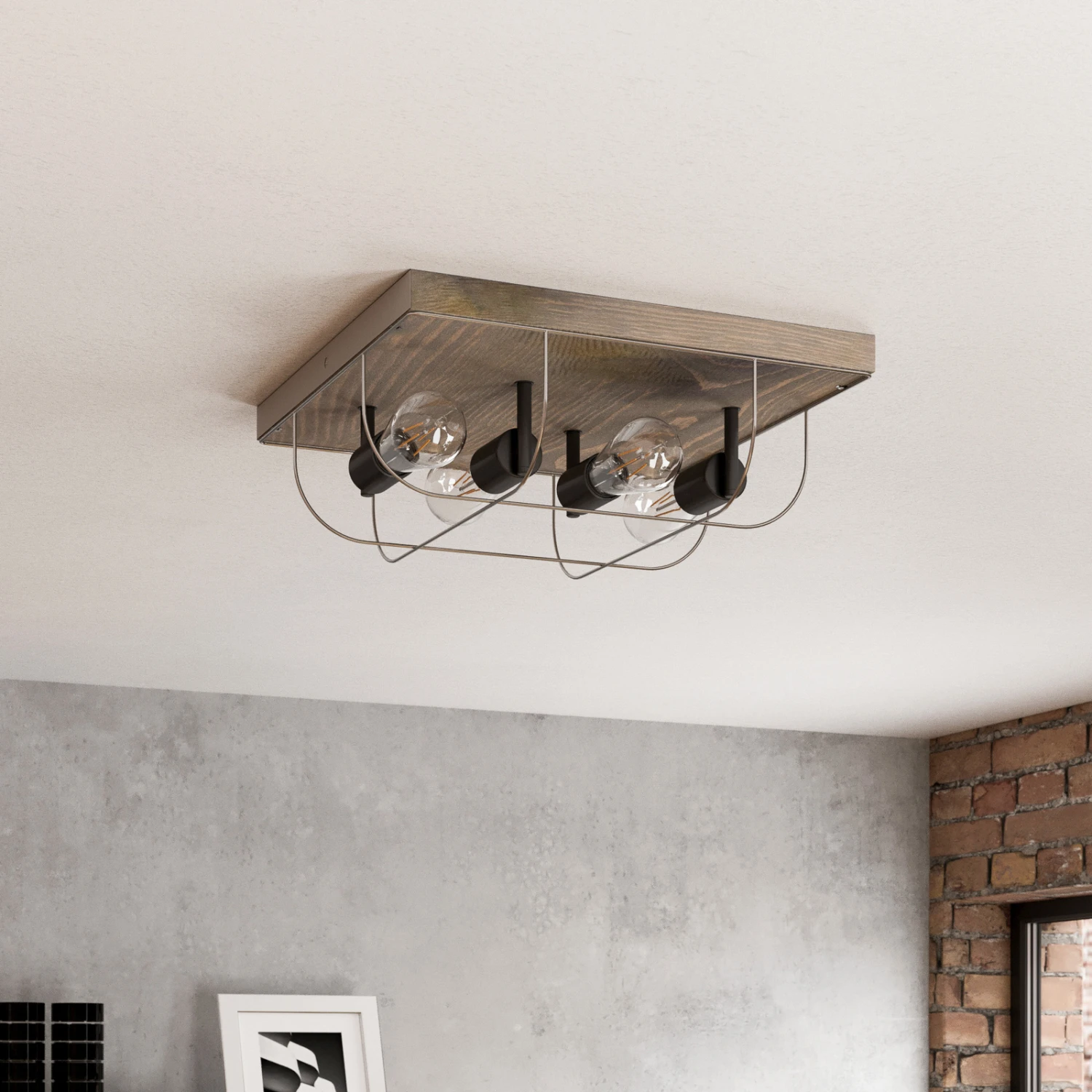 Die Deckenleuchte Neptuna verfügt über eine quadratische Kiefernholzplatte auf der vier schwarze Leuchtmittelfassungen befestigt sind. Diese werden von einem zierlichen, halbrunden Metallrahmen umspannt. Durch die harmonische und unaufdringliche Gestaltung fügt sich die Deckenleuchte gut in verschiedene Umgebungen ein und wertet zum Beispiel den Flurbereich, das Wohn- oder Schlafzimmer auf.