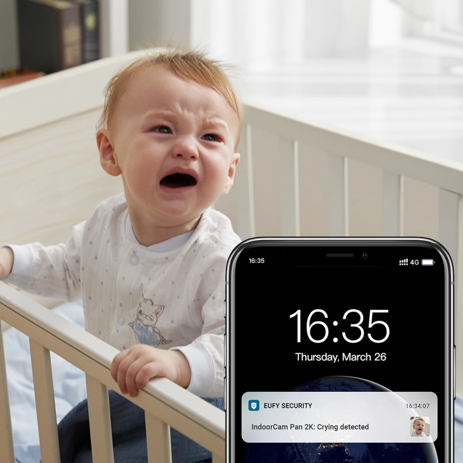 Die Sicherheitskamera 2K Indoor Cam folgt dank ihrer Bewegungserkennung und Schwenk- und Neigefunktion beim Erkennen einer Bewegung dem Objekt und behält es im Blickfeld. Die Kamera wird über das WLAN (Router erforderlich) mit dem Tablet/Smartphone gekoppelt und kann nun über die eufySecurity App konfiguriert werden, um beispielsweise eine Benachrichtigung bei erfassten Bewegungen oder bei einem erhöhten Geräuschpegel zu erhalten. Mit der Festlegung von Aktivitätszonen kann der Verwender selbst bestimmen, welcher gefilmte Bereich zu priorisieren ist. Auch bei Nacht wird durch die smarte Nachtsicht-Technologie ein klares Bild gewährleistet.