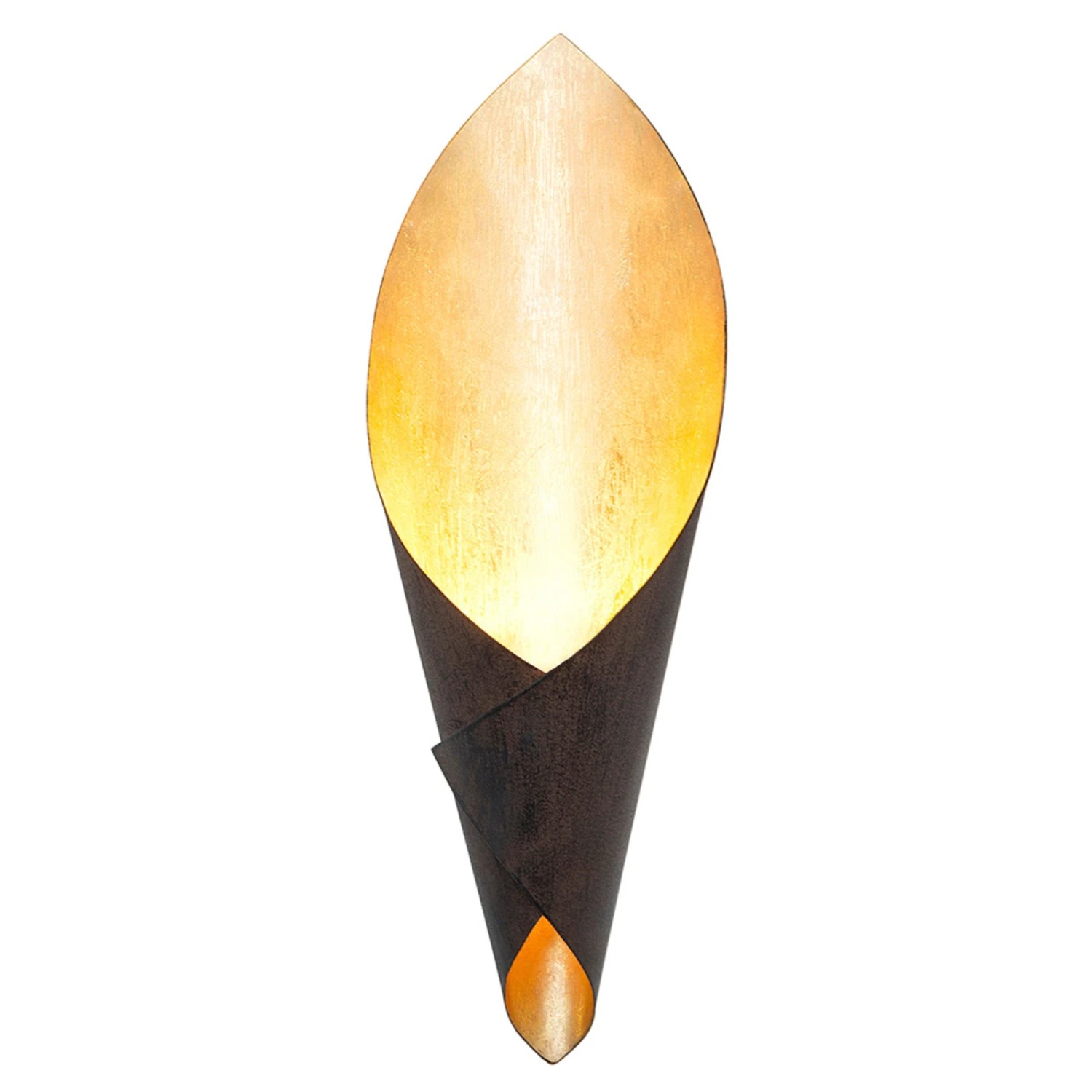 Mit großer Öffnung nach oben und goldfarbener Innenseite wurde der Metallschirm der Wandleuchte Fiaccola Piccolo aus schwarz-braunem Eisen gefertigt. Ein wenig erinnert die Gestaltung an die Blüte einer Calla. Die goldene Innenseite des Schirms zeichnet das Licht der Halogenlampe sehr weich und trägt entscheidend zur besonderen Wirkung der Wandleuchte bei.