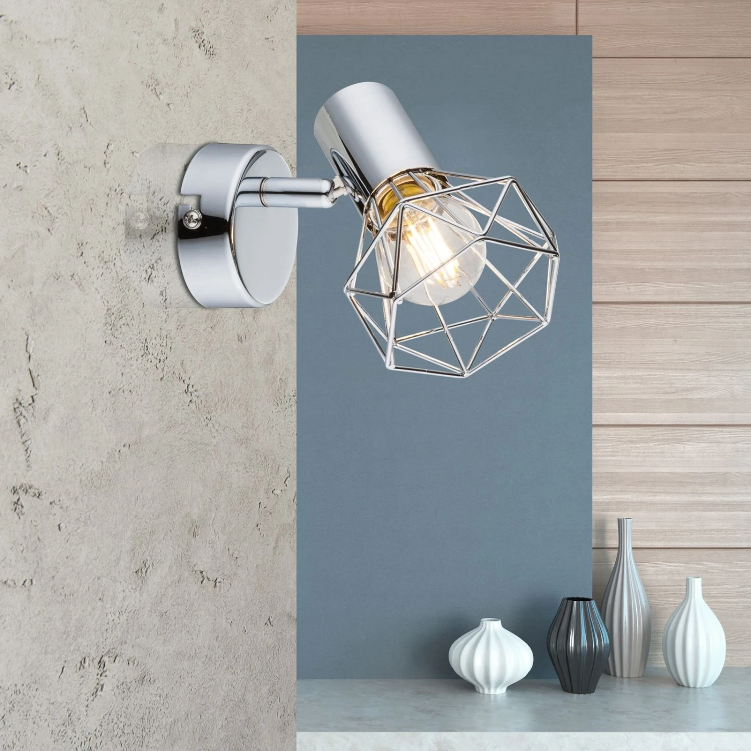 Der Wandstrahler Daiva bietet sich als sehr dekorative Variante unter den Strahlerleuchten an: Wandhalterung und Fassung präsentieren sich noch sehr dezent, der Schirm jedoch in eher ungewöhnlicher Optik: Er besteht einfach nur aus einem verchromten Metallkäfig, der den Blick auf das Leuchtmittel frei lässt. In die Fassung kann ein E14-Leuchtmittel mit max. 40 W eingesetzt werden. Da das Leuchtmittel zu sehen ist, bietet sich die Verwendung einer besonders dekorativen Lampe, wie z. B. eine Retrofit-Glühlampe, an. Passende Leuchtmittel sind unter Zubehör erhältlich.