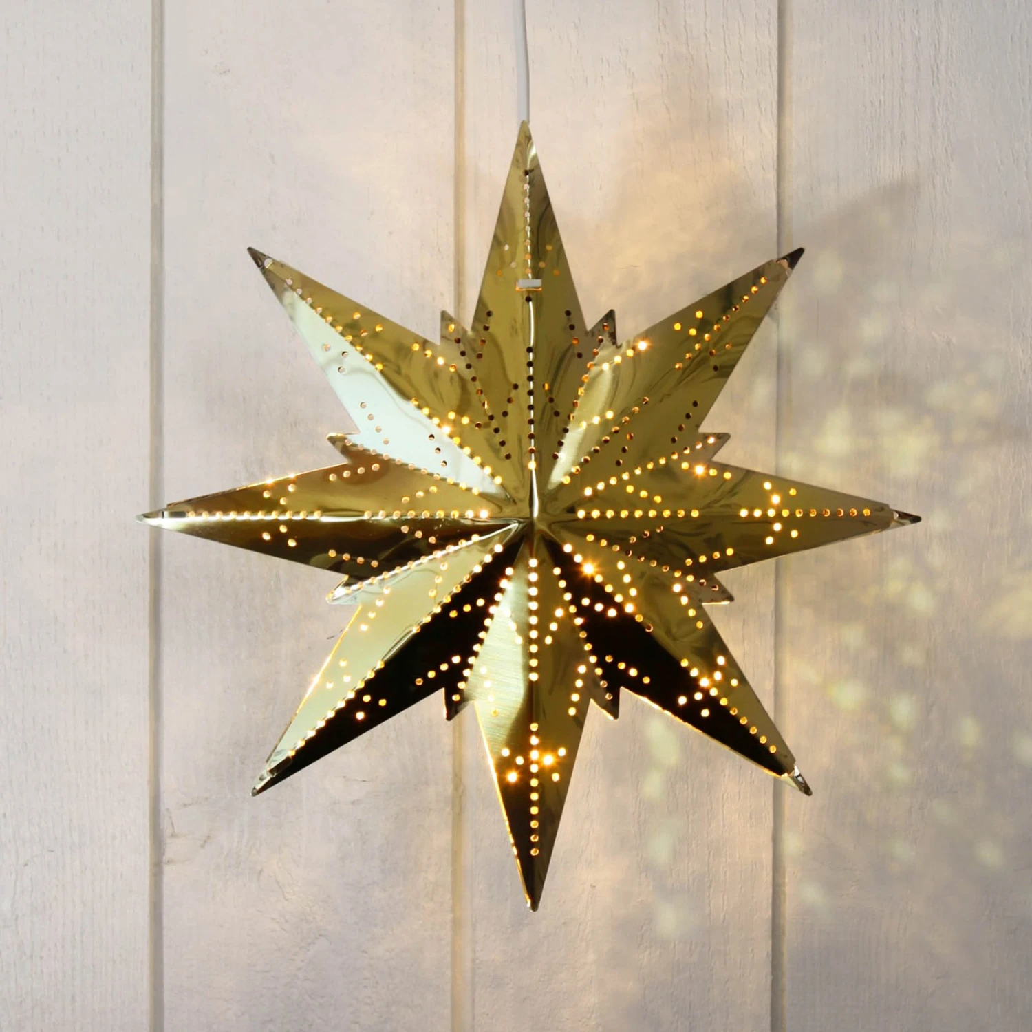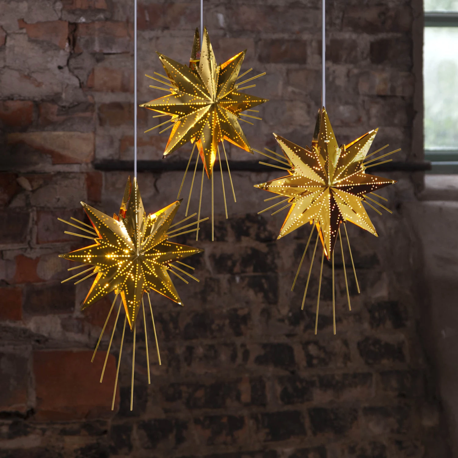 Der sehr ästhetisch gearbeitete Metallstern Mini wirkt mit dem ausgestanzten Lochmuster, durch das das Licht des eingesetzten Leuchtmittels hindurchdringt und das goldfarbene Metall noch stärker glänzen lässt, sehr attraktiv. Ein Dekorartikel für die Advents- und Weihnachtszeit, der frei im Raum schon seine glanzvolle Wirkung entfaltet, als Fensterdekoration offenbart sich jedoch seine volle Schönheit. Mit E14-Fassung ausgestattet. Ein passendes Leuchtmittel ist unter Zubehör separat erhältlich.