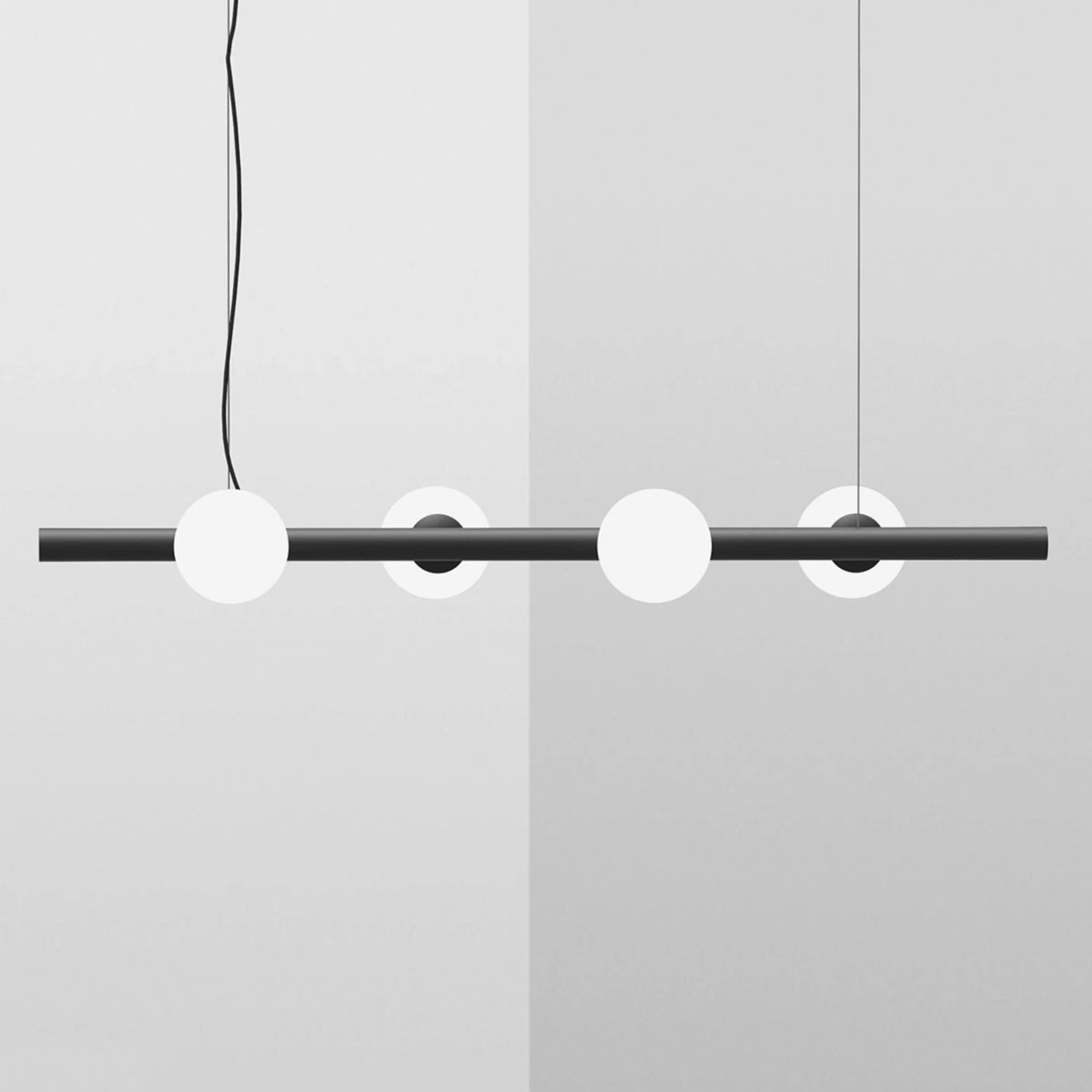 Die Balkenpendelleuchte Tin Tin bietet ein eher zurückhaltendes Erscheinungsbild. An einem Metallbalken in Form eines rundes Stabs sitzen links und rechts je zwei Schirme aus milchweißem Glas. Diese sorgen für eine gleichmäßige Beleuchtung ohne Blendwirkung.