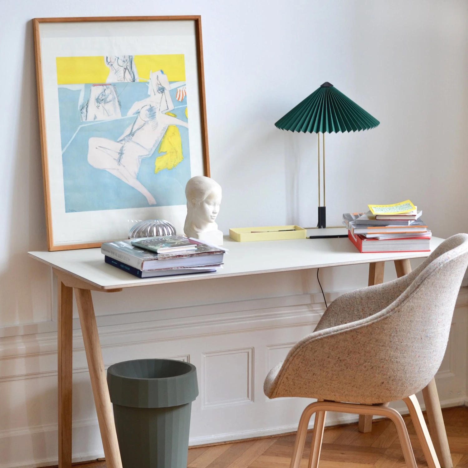 Die LED-Tischleuchte Matin ist ein Entwurf der französischen Designerin Inga Sempé, die in der Leuchte ein zeitgemäßes und dennoch poetisches Design und visuelle Feinheit mit physischer Robustheit verbindet. Inga Sempé lebt und arbeitet in Paris und wurde bereits im Jahr 2007 mit dem Red Dot Design Award ausgezeichnet. Ihre Arbeiten sind bekannt für eine besondere Leichtigkeit, eine starke Persönlichkeit und eine besonders taktile Art, wie auch die Tischleuchte Matin 300 eindrucksvoll unter Beweis stellt. Das Gestell der Tischleuchte besteht aus einem gebogenen Stahldrahtrahmen in poliertem Messing mit schwarzen Details aus ABS-Spritzguss. Auf diesem sitzt ein Schirm in weiter Form aus plissierter Baumwolle in schönen Farben, die auf eine PVC-Folie laminiert wurde.