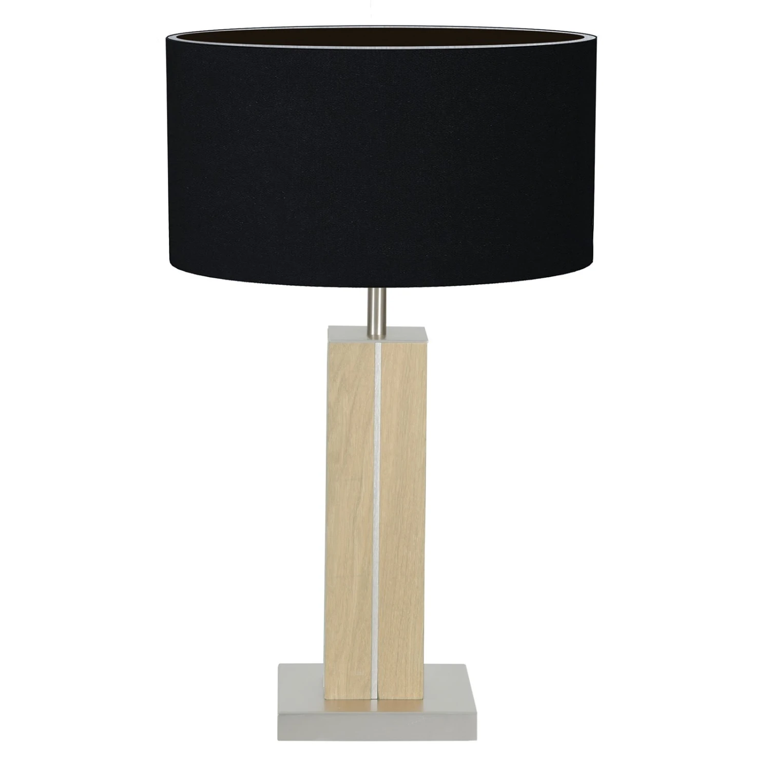 Ihr Schirm aus Baumwoll-Gewebe strahlt das Licht im Betrieb vertikal aus und bietet angenehme Grundbeleuchtung. Das Gestell wird von einem hohen Quader aus naturbelassenem Eichenholz dominiert, der von einem metallischen Streifen durchzogen ist. Hinzu kommen Abschnitte aus Metall an Standfuß und Schirmhalterung, die Dana einen modernen Anstrich verleihen.