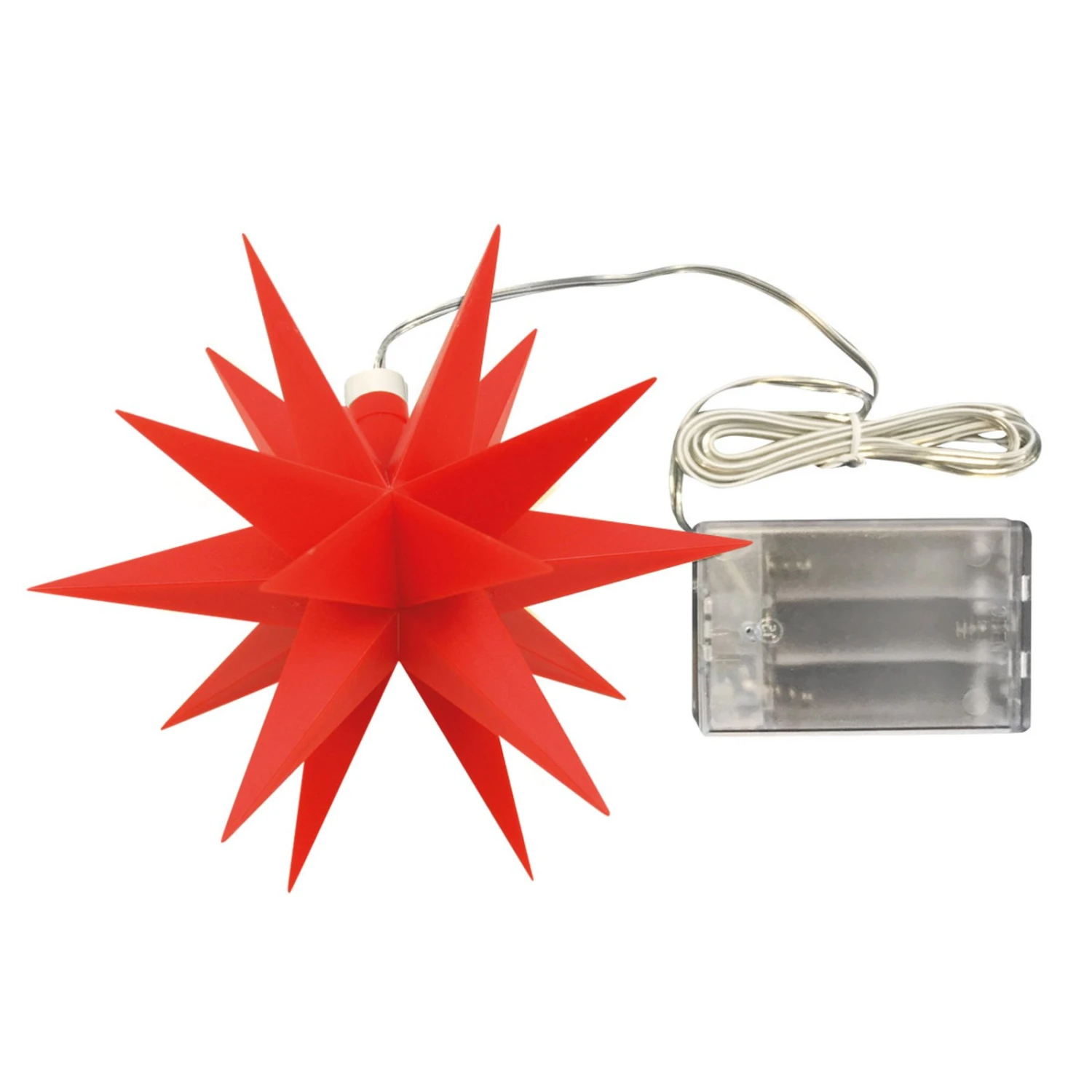 Der dekorative Stern wird von LEDs beleuchtet, deren Licht die ungewöhnliche Form mit den vielen Zacken besonders hübsch zur Geltung bringt. Es können drei AA-Batterien in das mitgelieferte Batteriefach eingesetzt werden. Passende Batterien sind separat über das Zubehör erhältlich.