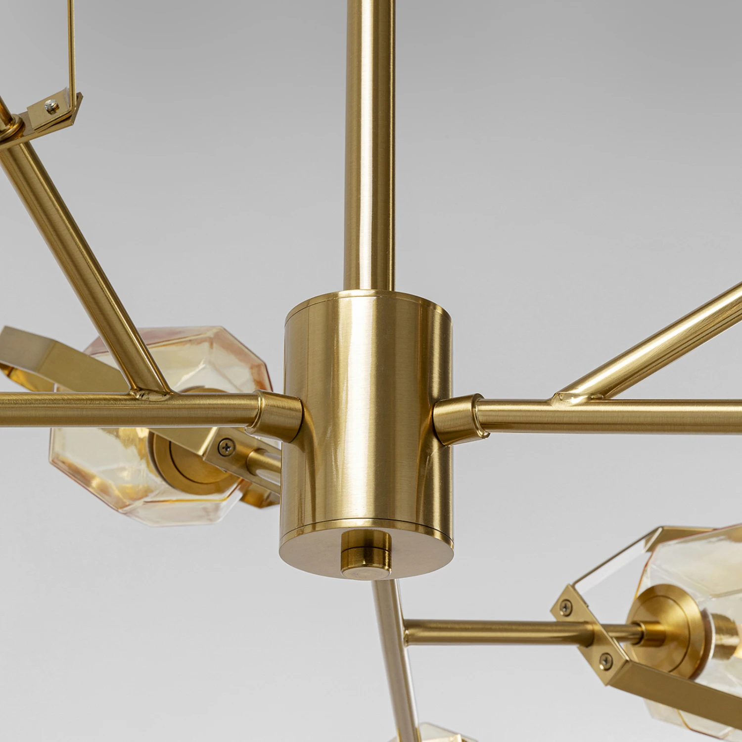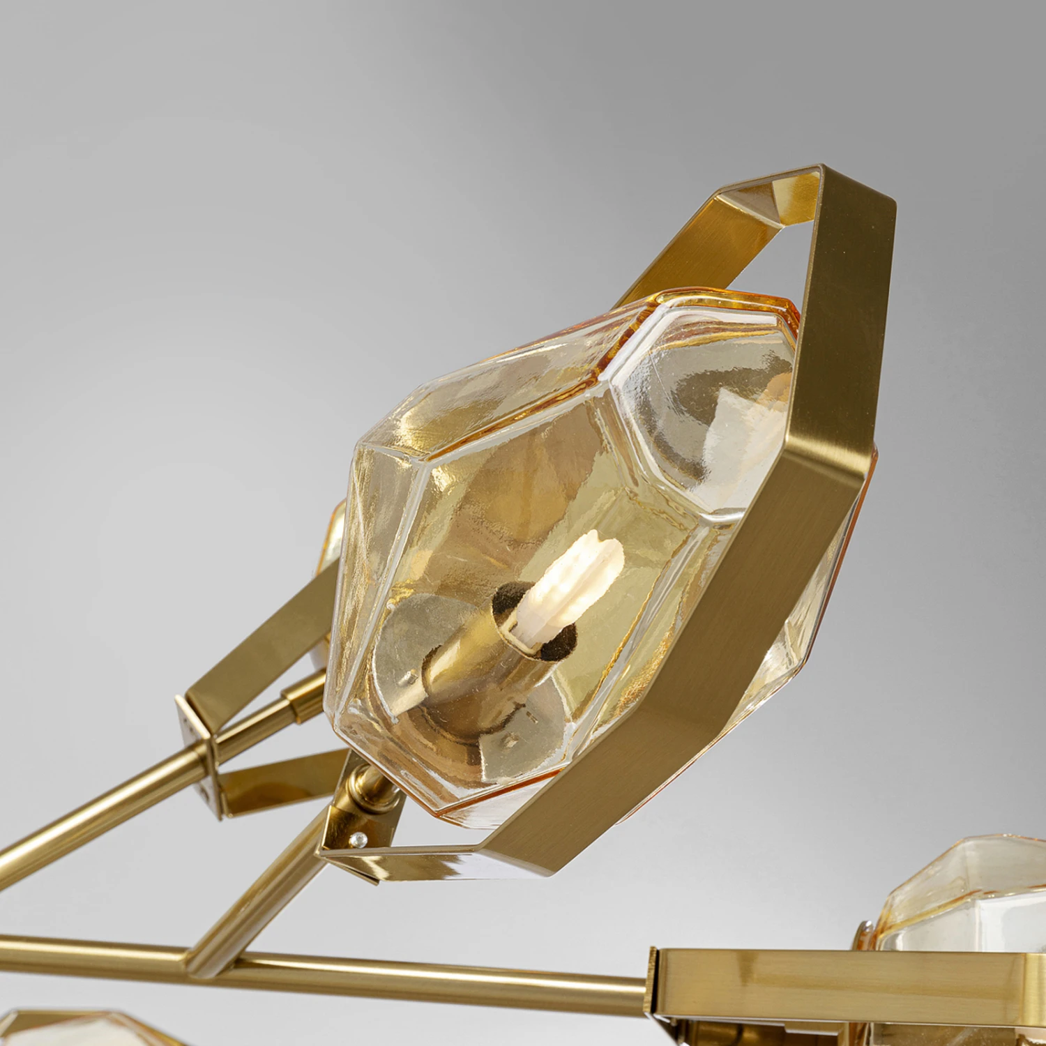 Von einer starren Abhängung ragen Arme in alle Richtungen, an denen in schmalen Metallrahmen die wie geschliffene Diamanten geformten Leuchtenschirme aus getöntem Glas angebracht wurden. Darin befinden sich die G9-Fassungen, die mit Leuchtmitteln nach Wunsch bestückt werden können. Das getönte Glas bewirkt eine weiche Lichtabstrahlung nach allen Seiten; die facettenreiche Form kommt im eingeschalteten Zustand ganz besonders zur Geltung und macht die Leuchte zum Blickfang über einem Tisch.