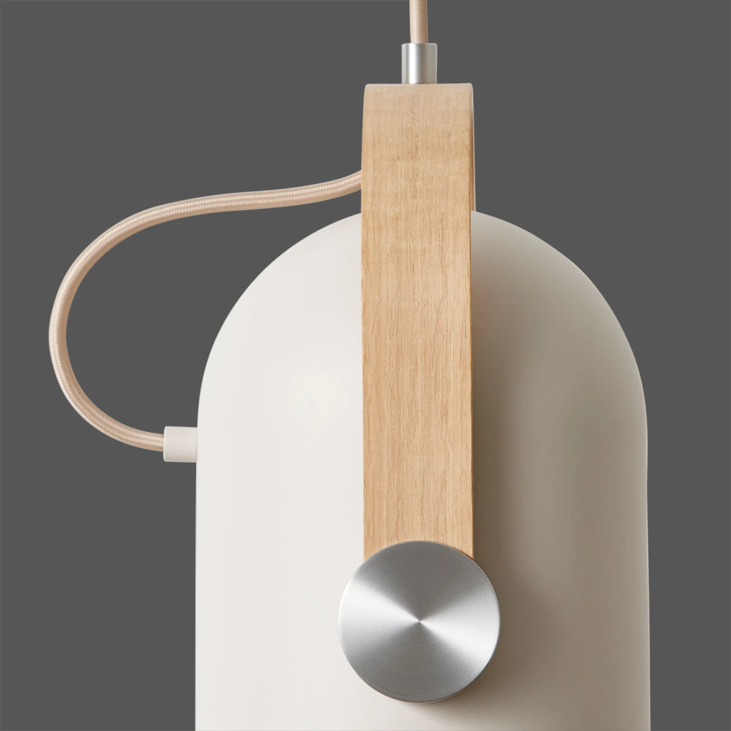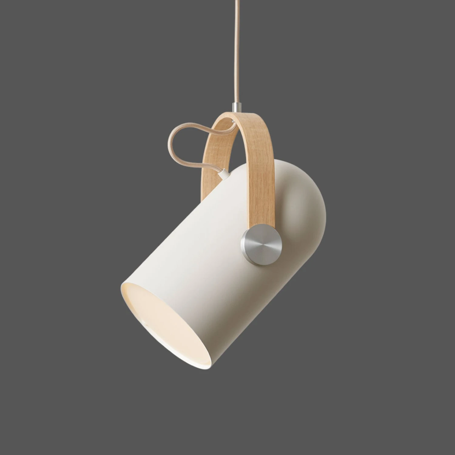 Sandfarbene Designer-Hängeleuchte Carronade mit Holzbügel