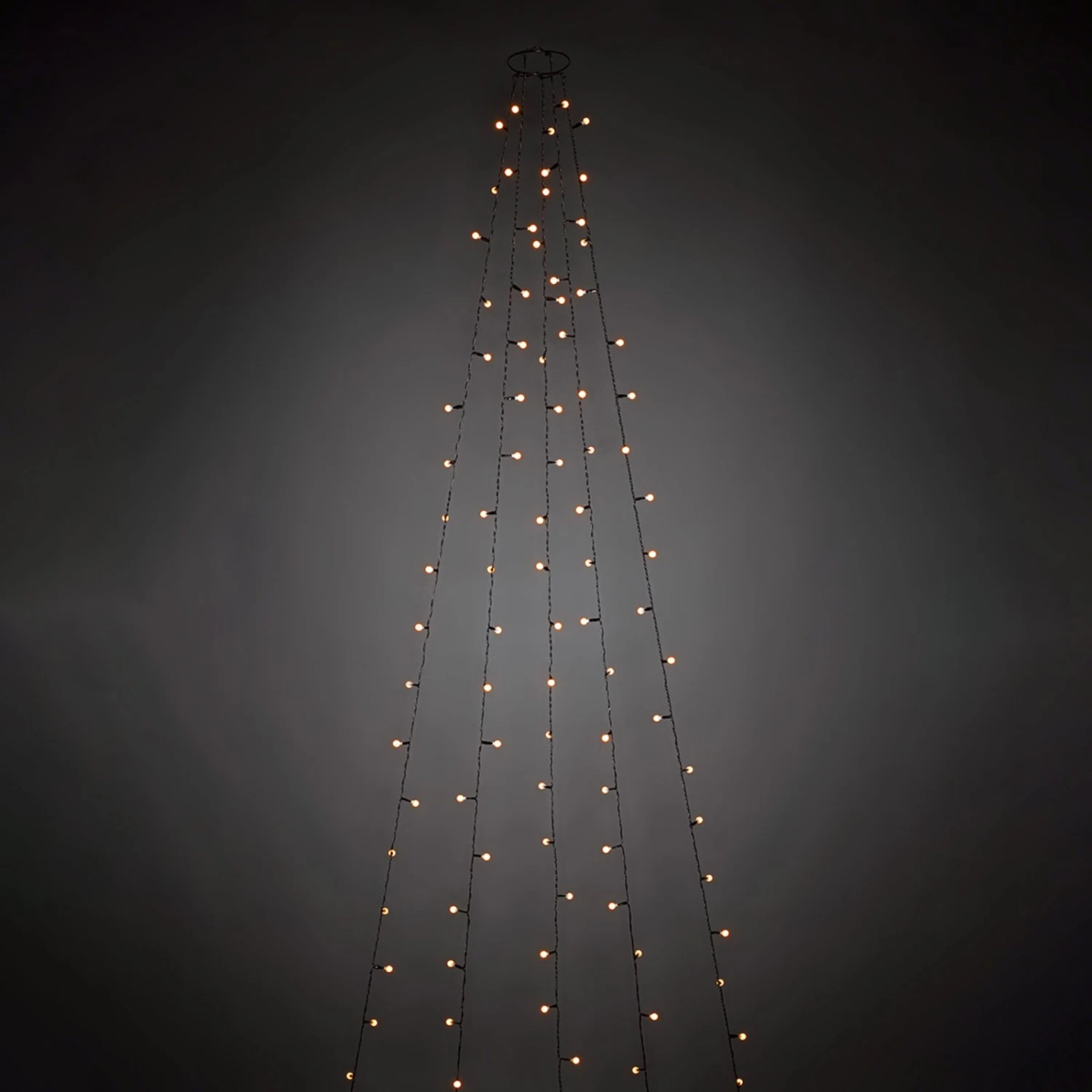 Einen Christbaum zu schmücken, muss nicht zeitaufwendig sein. Mit dem LED-Baummantel mit bernsteinfarben leuchtenden Dioden in vormontierten Globe-Lampen gestaltet sich die festliche Bestückung des Baumes ganz einfach. Der Baummantel wird einfach übergestülpt und schon fließen rundherum fünf Stränge über den Baum. Mit grünem Kabel ausgestattet.