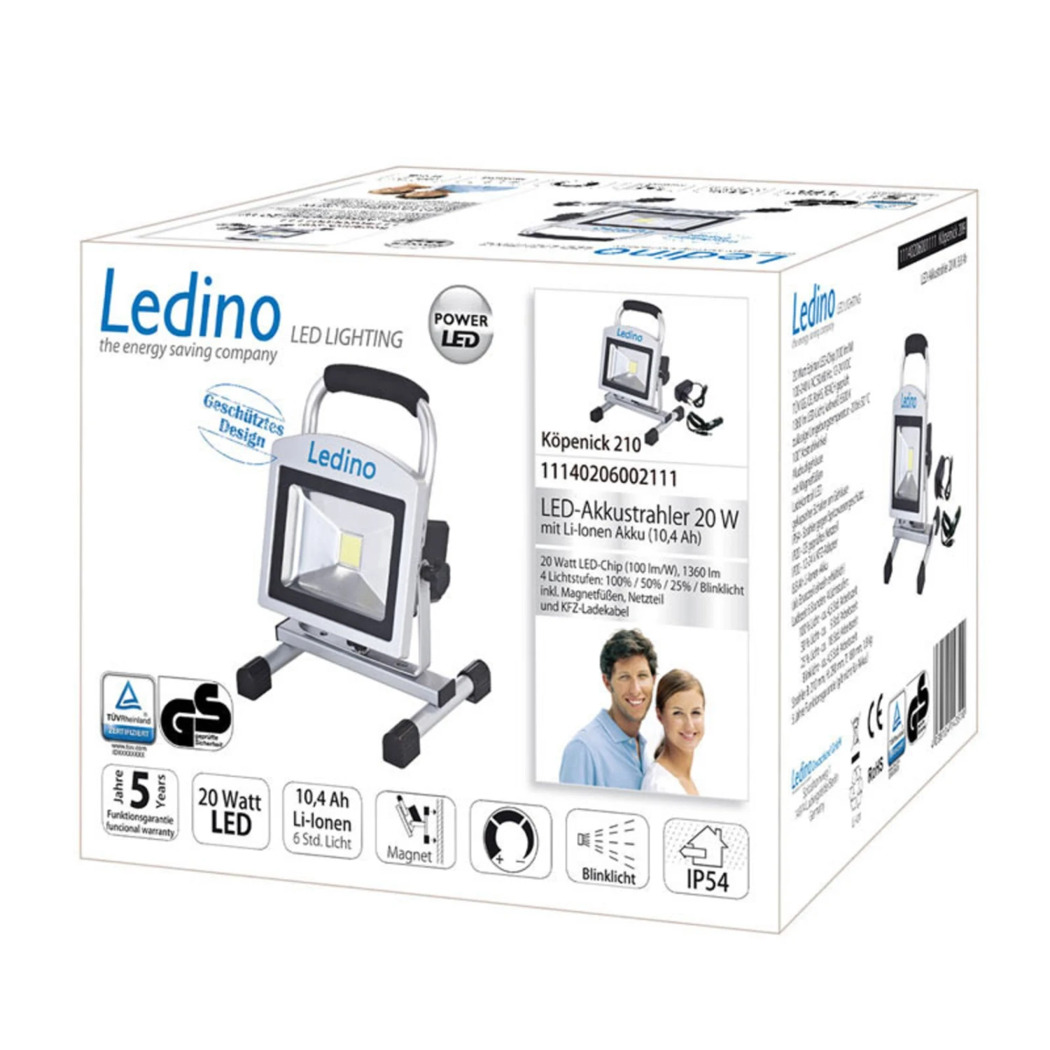 Der leistungsstarke 10,4 Ah Lithium-Ionen-Akku lässt sich bis zu 500 Mal aufladen. Nach der durchschnittlichen Ladezeit von 6 Stunden spendet der Akkustrahler Köpenick 210 bei 100% Lichtstärke 6 Stunden lang intensives Licht im kaltweißen Temperaturbereich. Bei 50% Lichtstärke beträgt die Arbeitszeit 12 Stunden, bei 25% ganze 24 Stunden. Der Fortschritt des Ladevorgangs lässt sich anhand einer LED-Kontrollleuchte ablesen. Im Lieferumfang sind ein KFZ-Adapter sowie ein Netzteil enthalten.