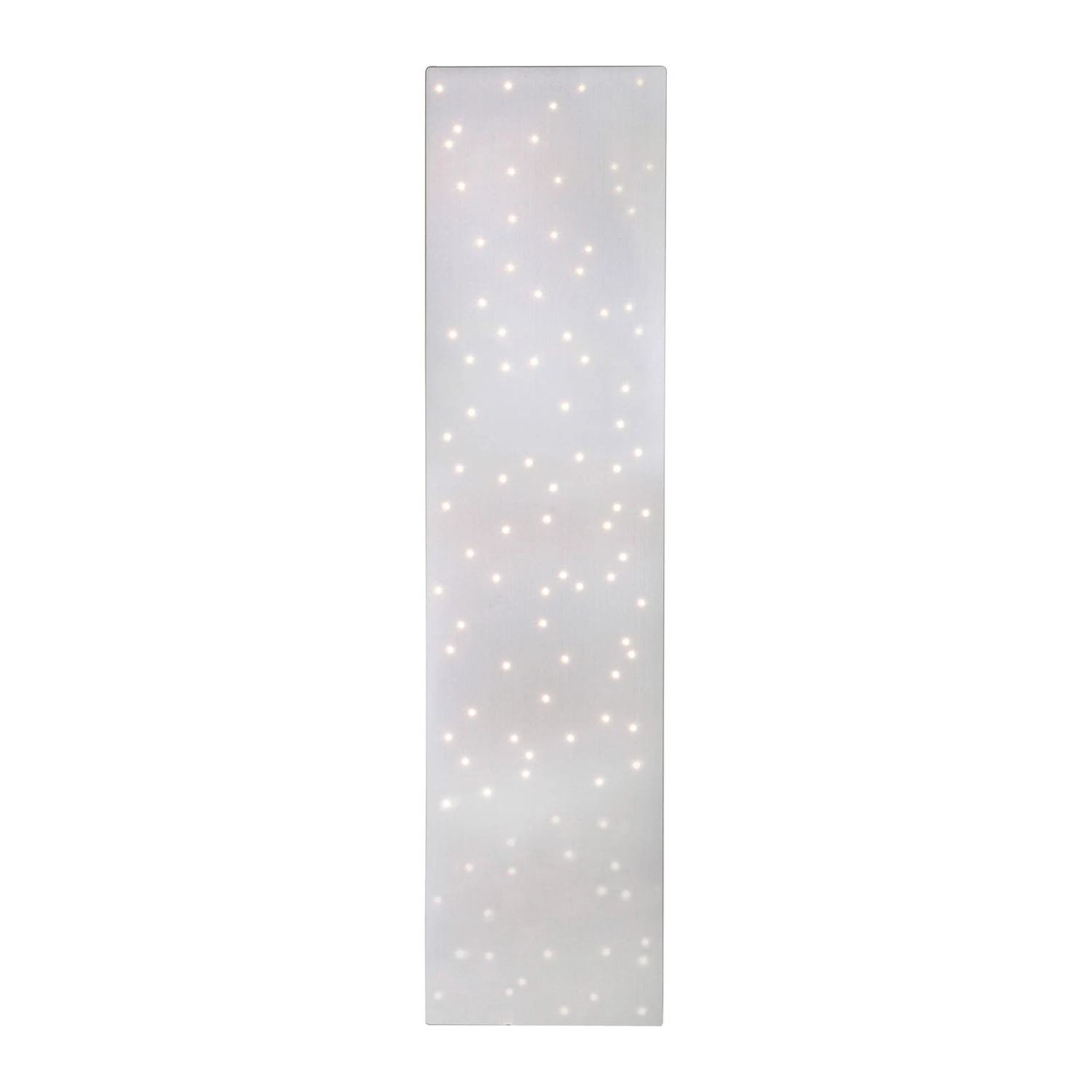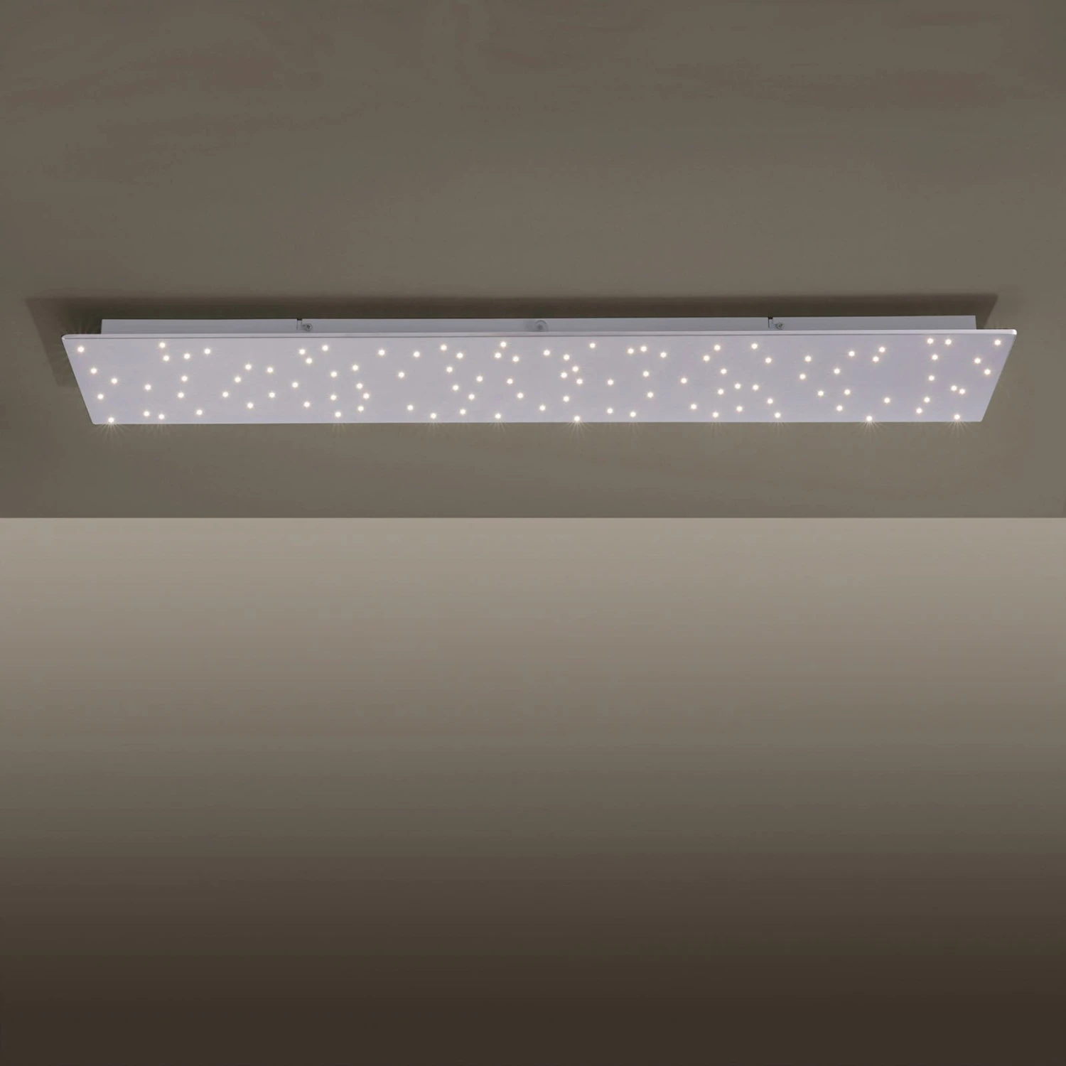 Für großzügige und stimmungsvolle Beleuchtung im Raum sorgt diese rechteckige, sehr flache LED-Deckenleuchte Sparkle. In die stahlfarbene Metalloberfläche sind lichtdurchlässige Punkte eingearbeitet. Hinter ihnen sitzt das LED-Modul, dessen Licht durch die Punkte nach außen treten kann und eine Optik erzeugt, die einem Sternenhimmel gleicht. Dadurch kann Sparkle nicht nur zur allgemeinen Beleuchtung, sondern auch zur Akzentbeleuchtung eingesetzt werden. Die harmonische Raumatmosphäre wird durch praktische Funktionen in der Lichtgestaltung bereichert. Die Deckenlampe kann über die mitgelieferte Fernbedienung in der Helligkeit gedimmt werden und auch die Lichtfarbe lässt sich von Warmweiß bis Universalweiß einstellen. So kann sie ganz bequem vom Sofa aus bedient werden oder man nutzt zum Ein- und Ausschalten den vorhandenen Wandschalter.