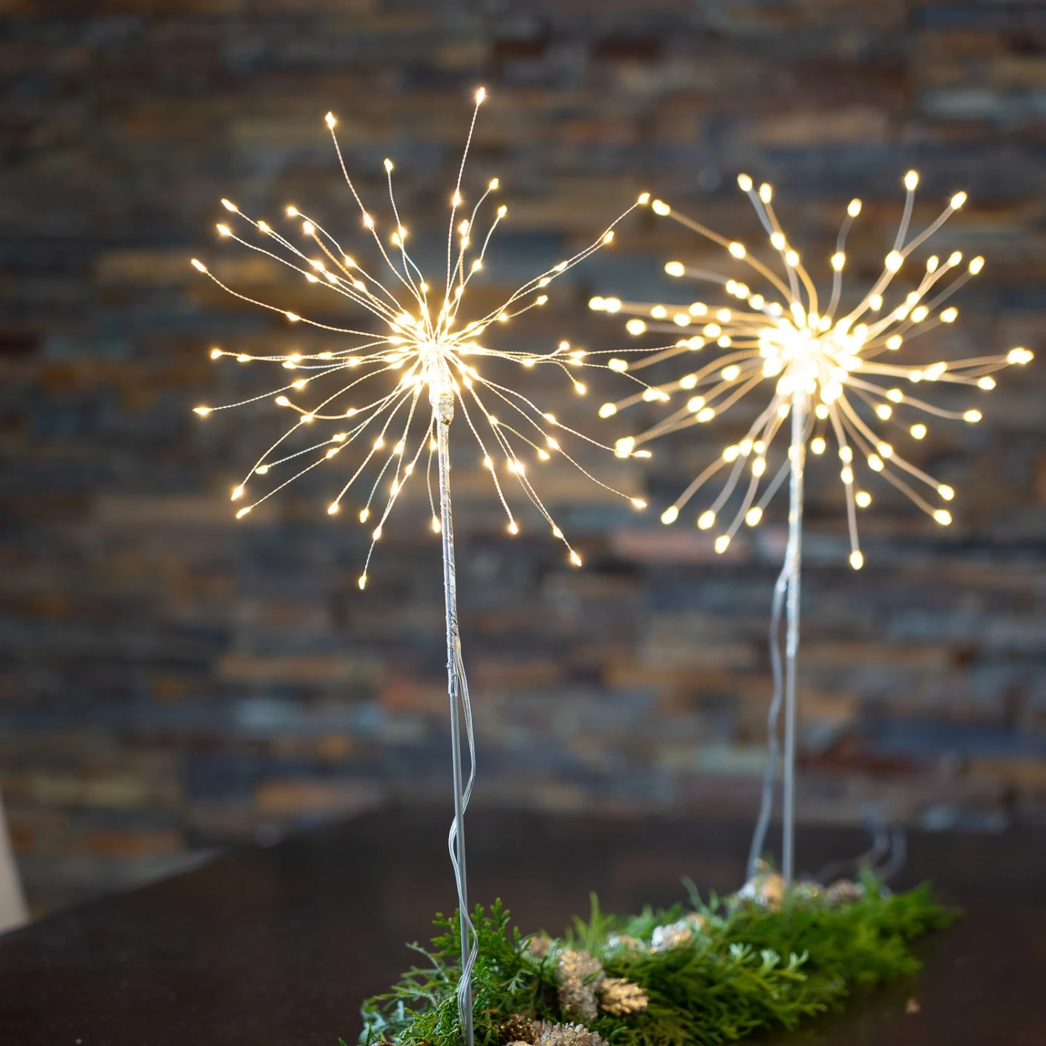 Beeindruckende LED-Dekoleuchte Firework Mit ihren 120 LEDs, die hier mit einem angenehmen, warmweißen Licht strahlen, wirkt die dekorative Leuchte nach dem Einschalten des Lichts beeindruckend dreidimensional. Die kleinen Lichtpunkte wirken hier wie einzelne Leuchtpunkte eines Feuerwerks am Nachthimmel. Egal, wo diese LED-Dekoleuchte platziert wird, sie macht zu jeder Jahreszeit eine gute Figur. Der Transformator ist im Lieferumfang enthalten.