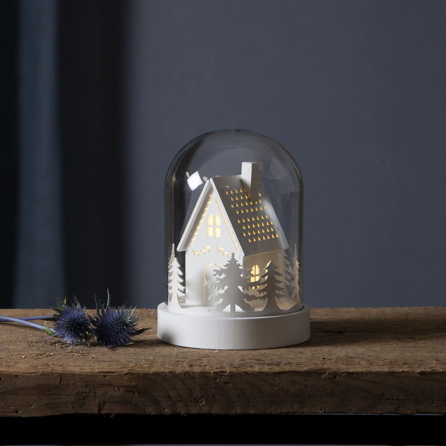 Sanft beleuchtete LED-Dekoleuchte Kupol mit Hausszene