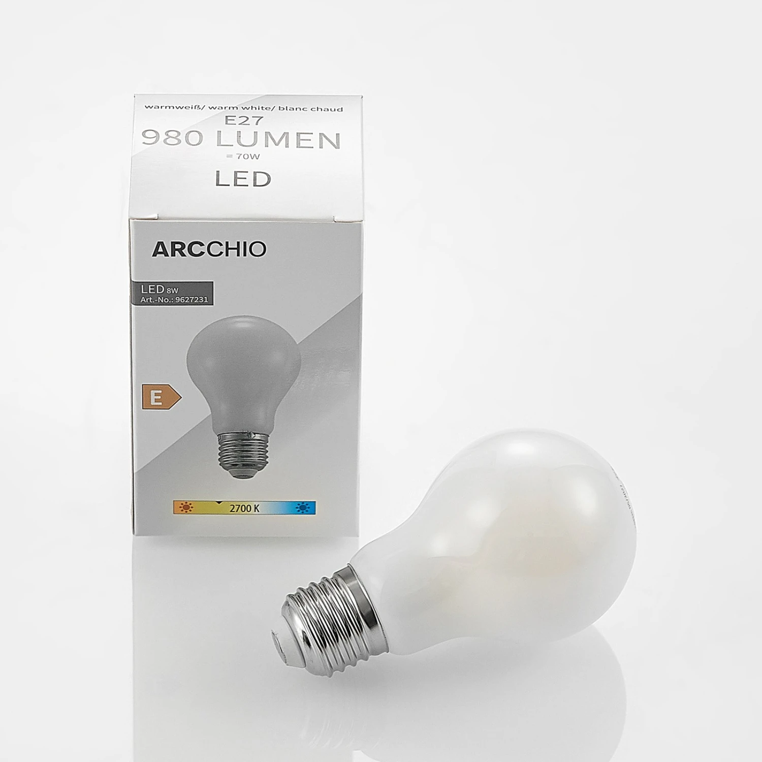 Diese LED-Lampe präsentiert sich in opalweißer Optik und ist daher blendfrei. Die Helligkeit gleicht der einer Glühlampe mit 70 W, wobei die LED-Technik wesentlich stromsparender ist. Die Lampe kann mit einem gängigen Wanddimmer in ihrer Helligkeit verstellt werden.