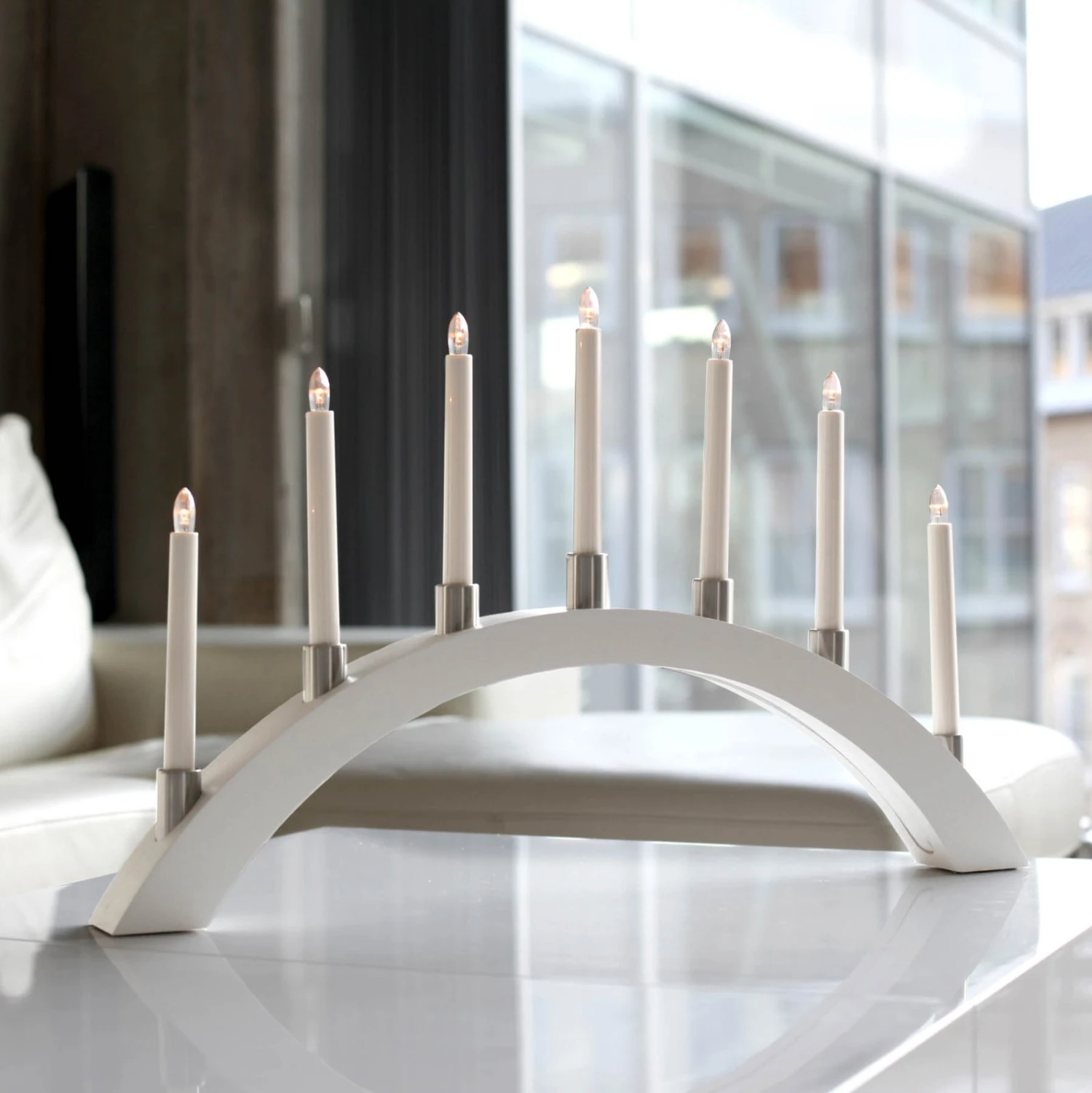 Das Besondere an diesem Lichterbogen ist, dass die sieben Kerzen mit LED-Leuchtmitteln ausgestattet sind, so dass der gesamte Lichterbogen insgesamt nur 0,7 Watt benötigt. Sparsamer und schöner kann Weihnachtsbeleuchtung kaum sein!