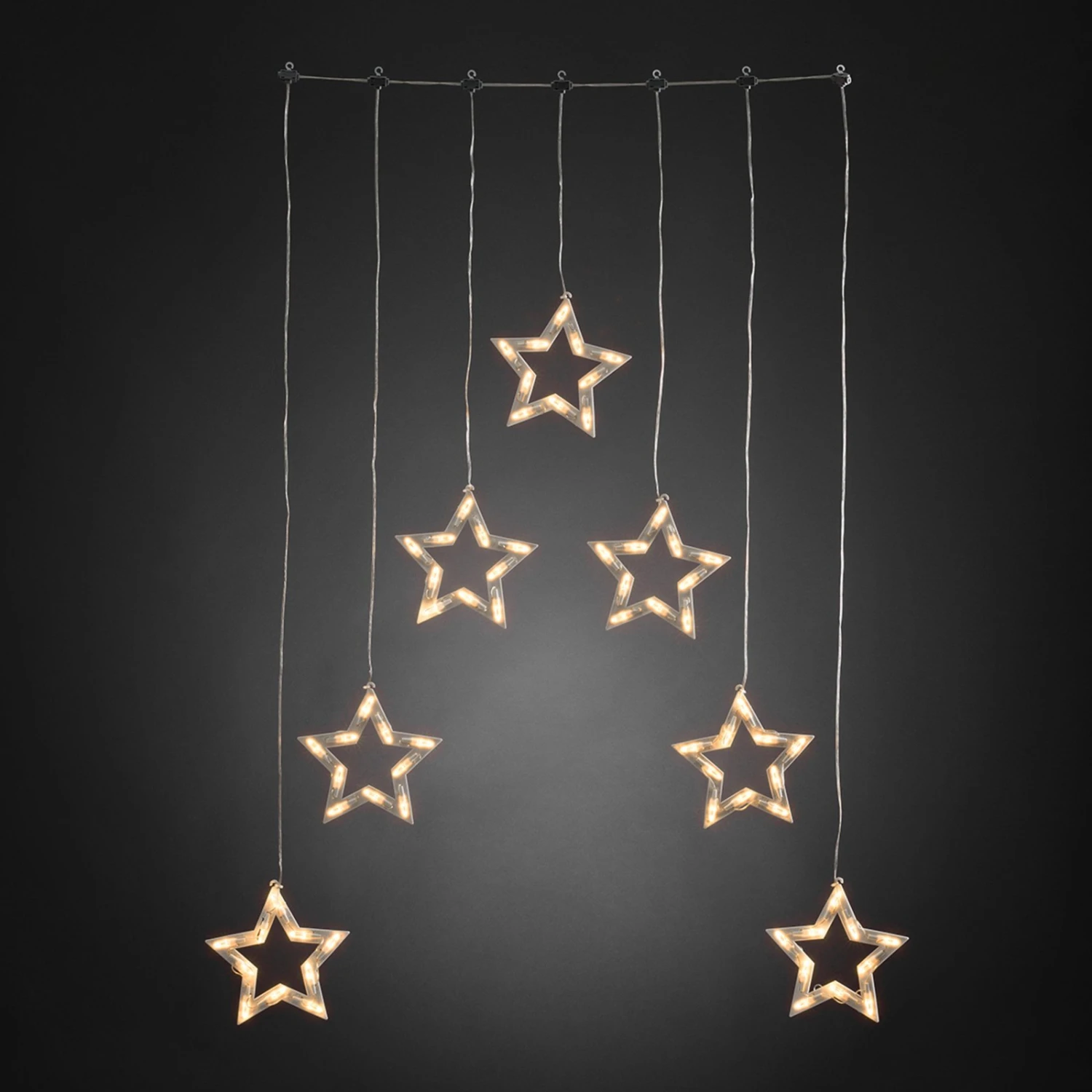 Die sieben transparenten Sterne dieses schönen Lichtervorhangs für den Außenbereich leuchten in stimmungsvollem, warmweißem Licht in der dunklen Nacht und stimmen auf die Weihnachtszeit ein. Im Lieferumfang ist ein Außentrafo enthalten.