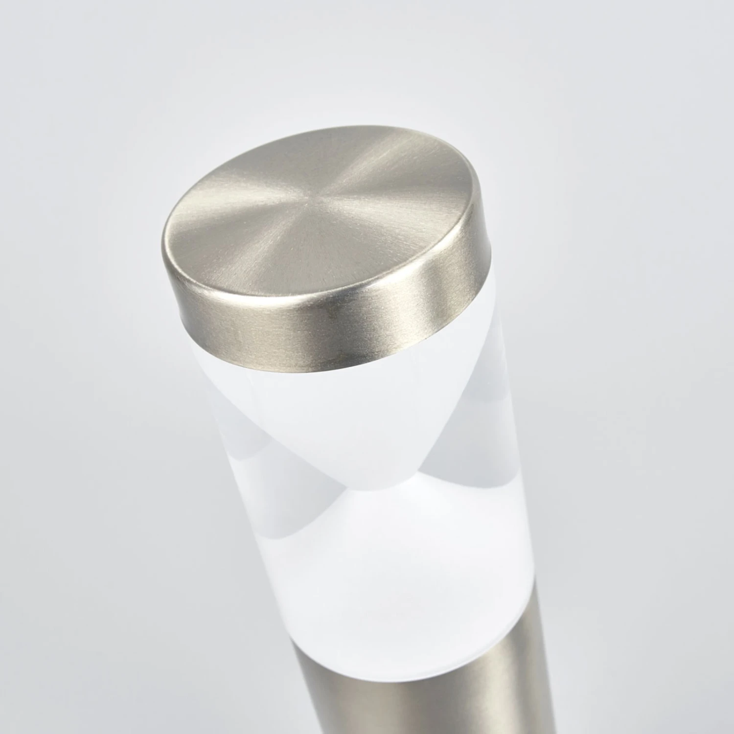 Diese LED-Sockellampe stellt im Außenbereich eine sehr nützliche Ergänzung dar. Der größte Teil der Leuchte besteht aus Edelstahl, nur oben wird Fabrizio ergänzt von einem Einsatz aus Acryl. Genau genommen handelt es sich um zwei Elemente: ein klares, röhrenförmiges außen und satinierten Kunststoff in Form einer Sanduhr im Inneren der Leuchte. Die Satinierung stellt sicher, dass der Lichtschein eine gleichmäßigere Verteilung erfährt.