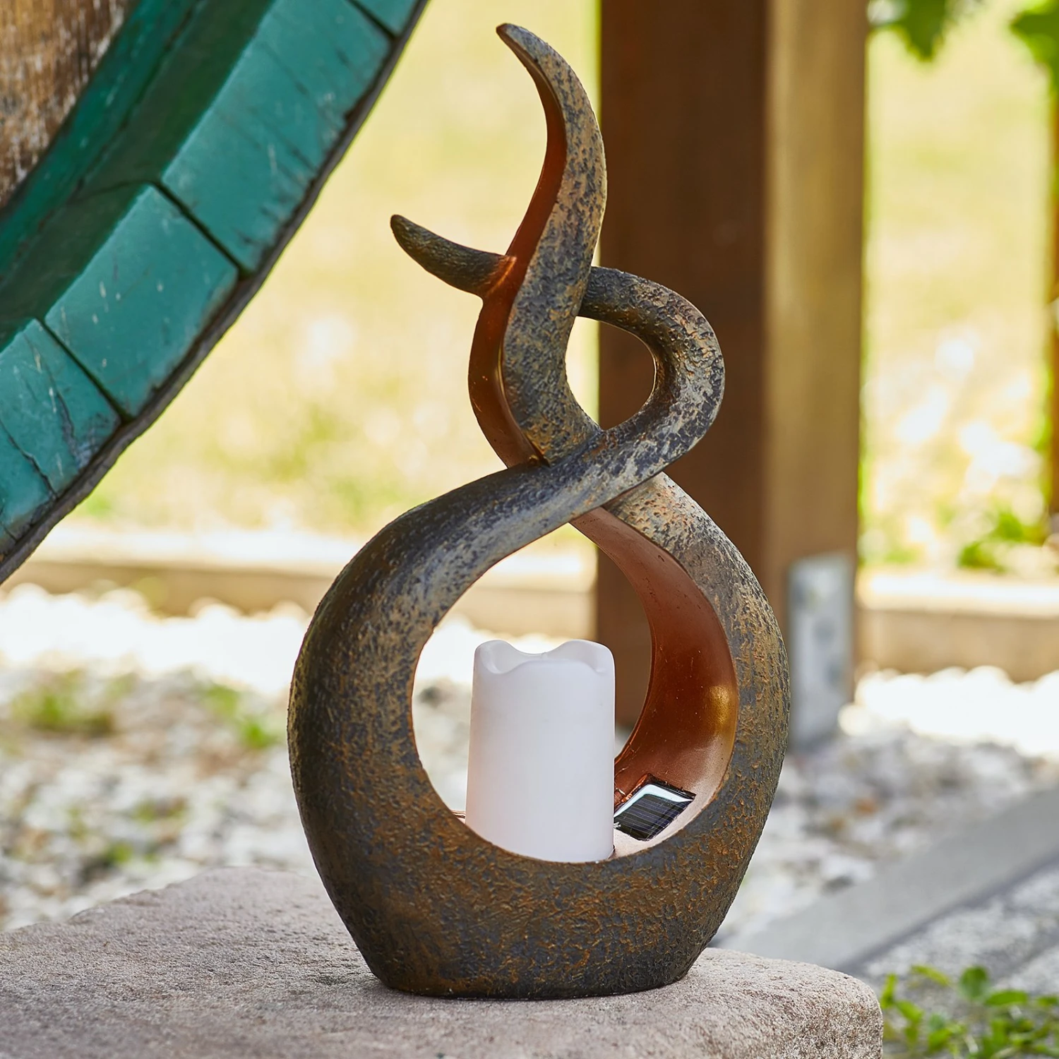 Ein wenig orientalischen Charme verbreitet die LED-Solar-Dekorationsleuchte Oriental. Sie wurde aus Metall gefertigt, das in einem schönen Braun- und Kupferton versehen wurde. Am Boden dieses Metallelements sitzt eine täuschend echte Imitation einer Kerze mit LEDs im Innern.
