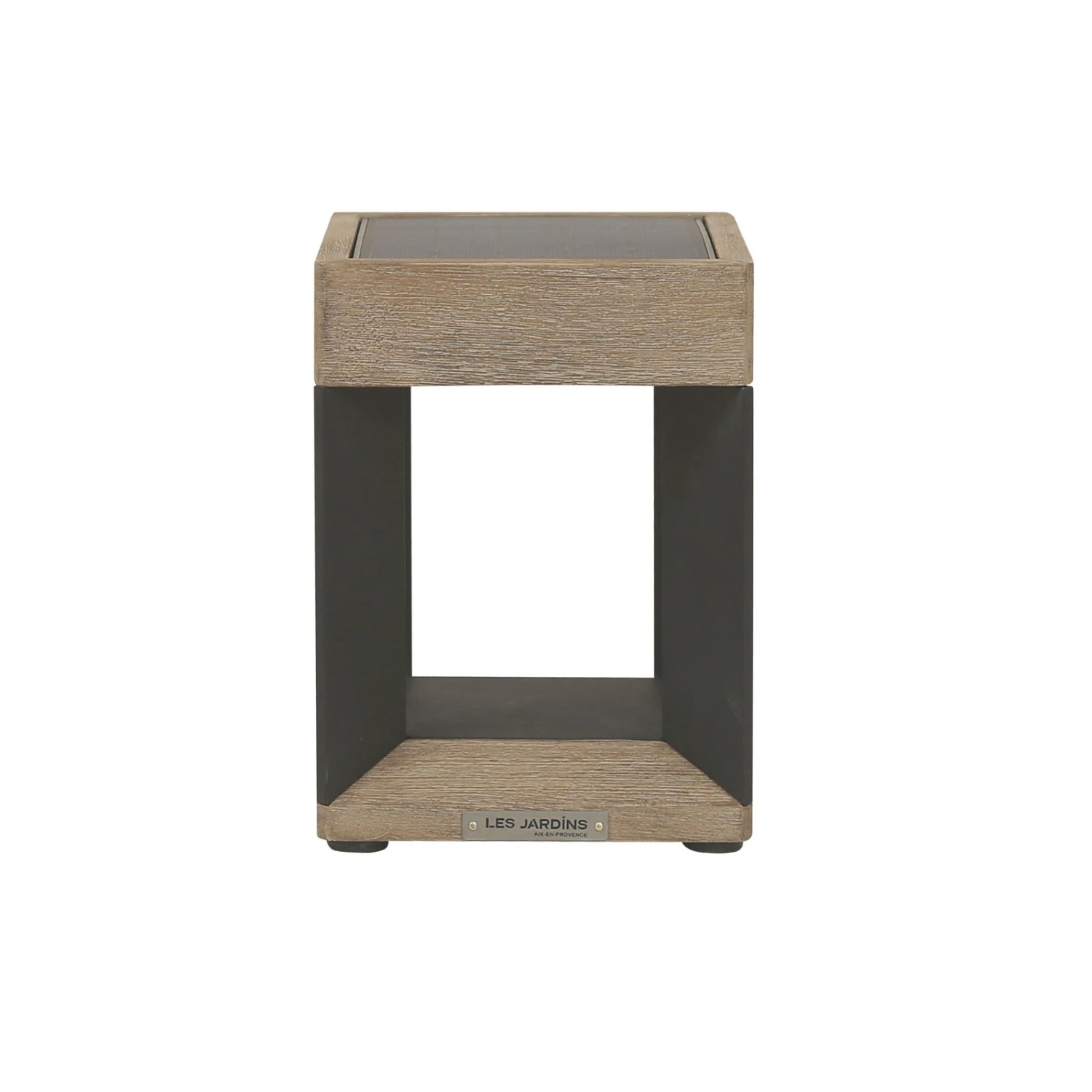 Die aus äußerst pflegeleichtem Teakholz hergestellte Tischleuchte Teckalu verfügt zusätzlich über einen Aluminiumrahmen, der Stabilität und Robustheit mit sich bringt. Das Teakholz wurde kräftig gebürstet, um ein strukturiertes Finish zu erhalten. Als erste Schicht dient eine wasserfeste Grundierung, auf die dann fünf Schichten graues Finish aufgetragen wurden. Dieses Verfahren schützt das Holz vor Witterungseinflüssen und UV-Strahlen (nicht ölen, nur mit Seifenwasser reinigen). Das Licht der LEDs kann nach allen Seiten hin austreten, Teckalu eignet sich daher ideal, um Tische auf Terrassen zu beleuchten.