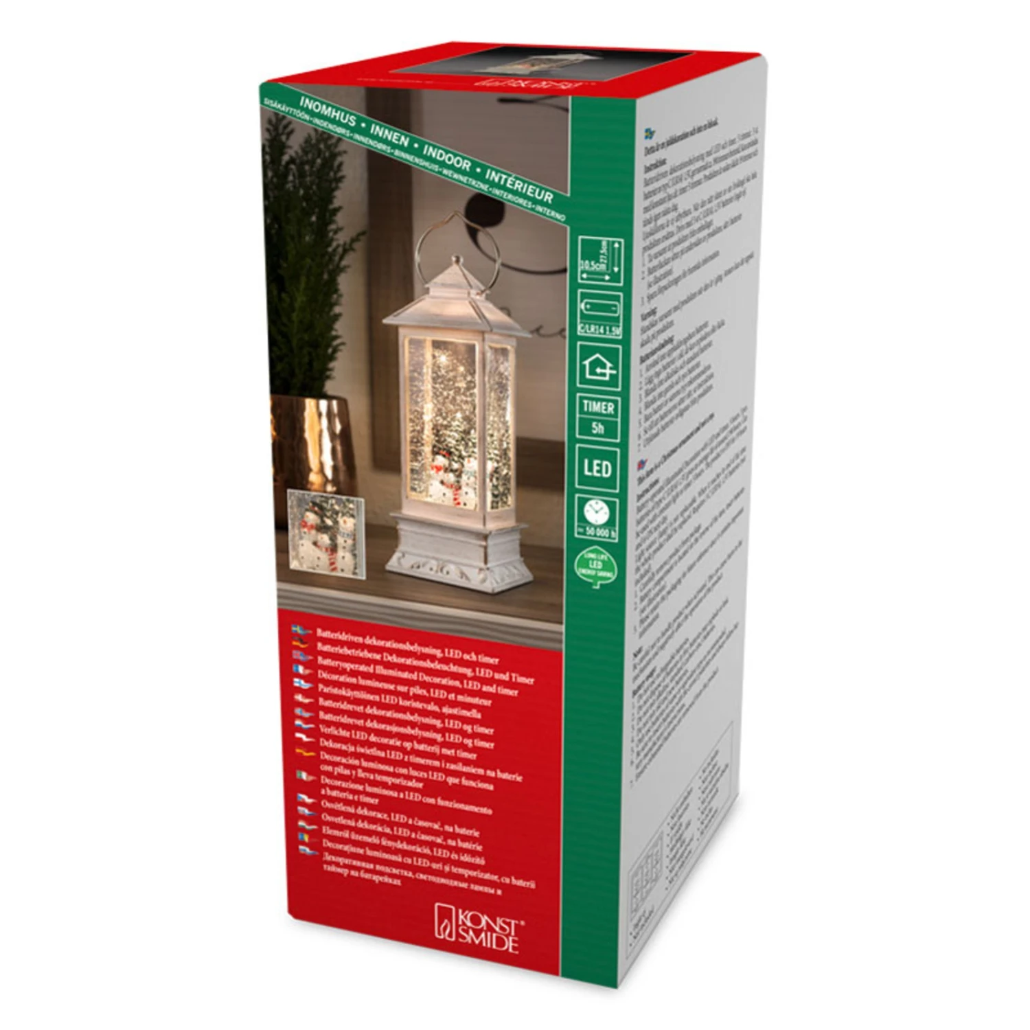 Die Schneemänner im Inneren der mit Wasser gefüllten Dekolaterne werden von einer warmweiß leuchtenden LED mit behaglichem Lichtschein angestrahlt. Die kleinen im Wasser schwimmenden Metallpartikel funkeln wundervoll im Licht. Eine festliche Atmosphäre entsteht, egal, wo die LED-Wasserlaterne Schneemänner platziert wird. Es wird keine Steckdose benötigt. Es müssen drei C-Batterien (1,5 V – über Zubehör erhältlich) eingesetzt werden. Der eingebaute 5-Stunden-Timer schaltet die Laterne jeden Tag zur selben Zeit ein und nach fünf Stunden automatisch auch wieder aus.