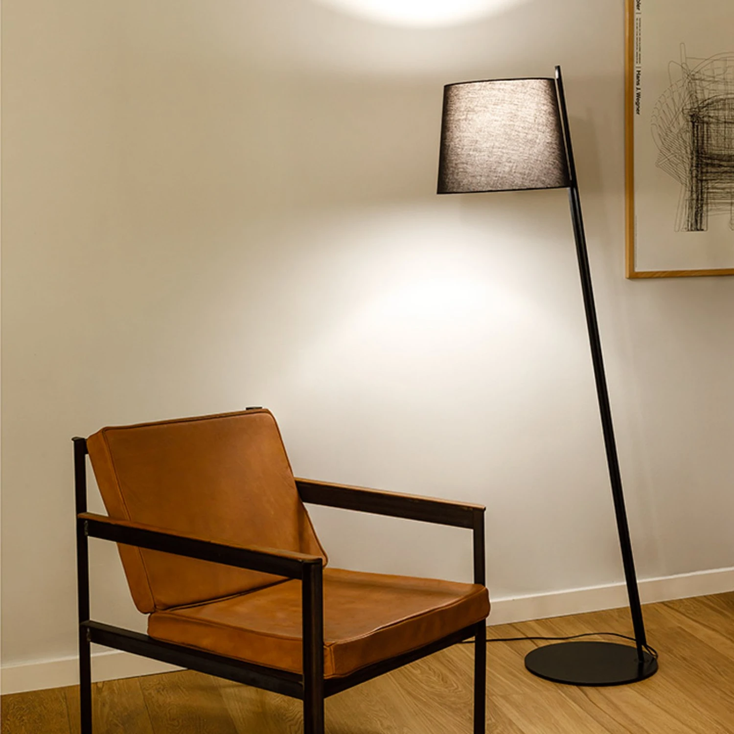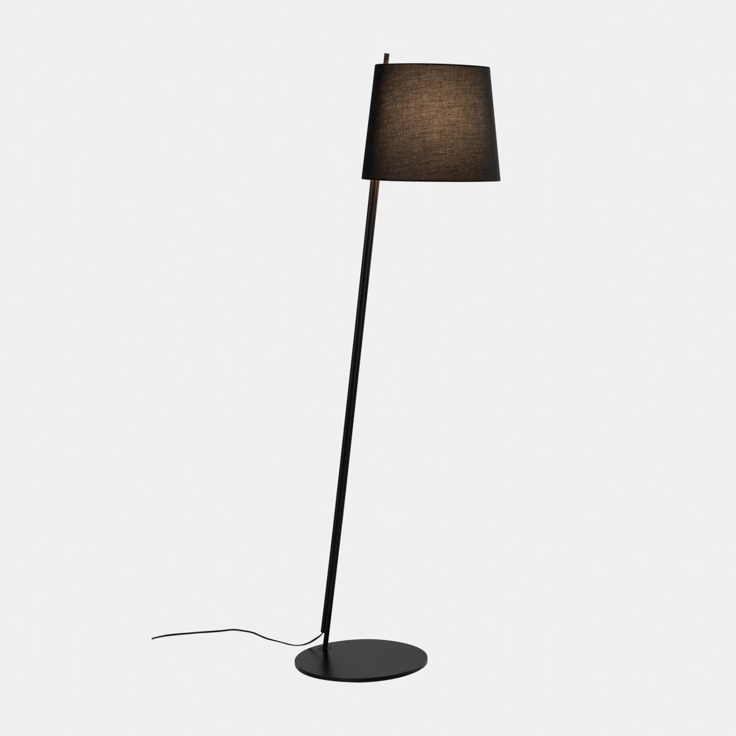 Als wohnlicher Lichtspender bereichert die Stehlampe Clip das Wohn- oder Schlafzimmer. Der Lampenschirm in der Form eines Kegelstumpfs ist aus Textil gearbeitet; das Gewebe lässt das Licht des einzusetzenden Leuchtmittels sanft nach außen strahlen. Das schwarze, aus Stahl gefertigte Gestell setzt sich aus einem hohen, leicht nach vorn geneigten Ständer und einer flachen, runden Fußplatte zusammen.