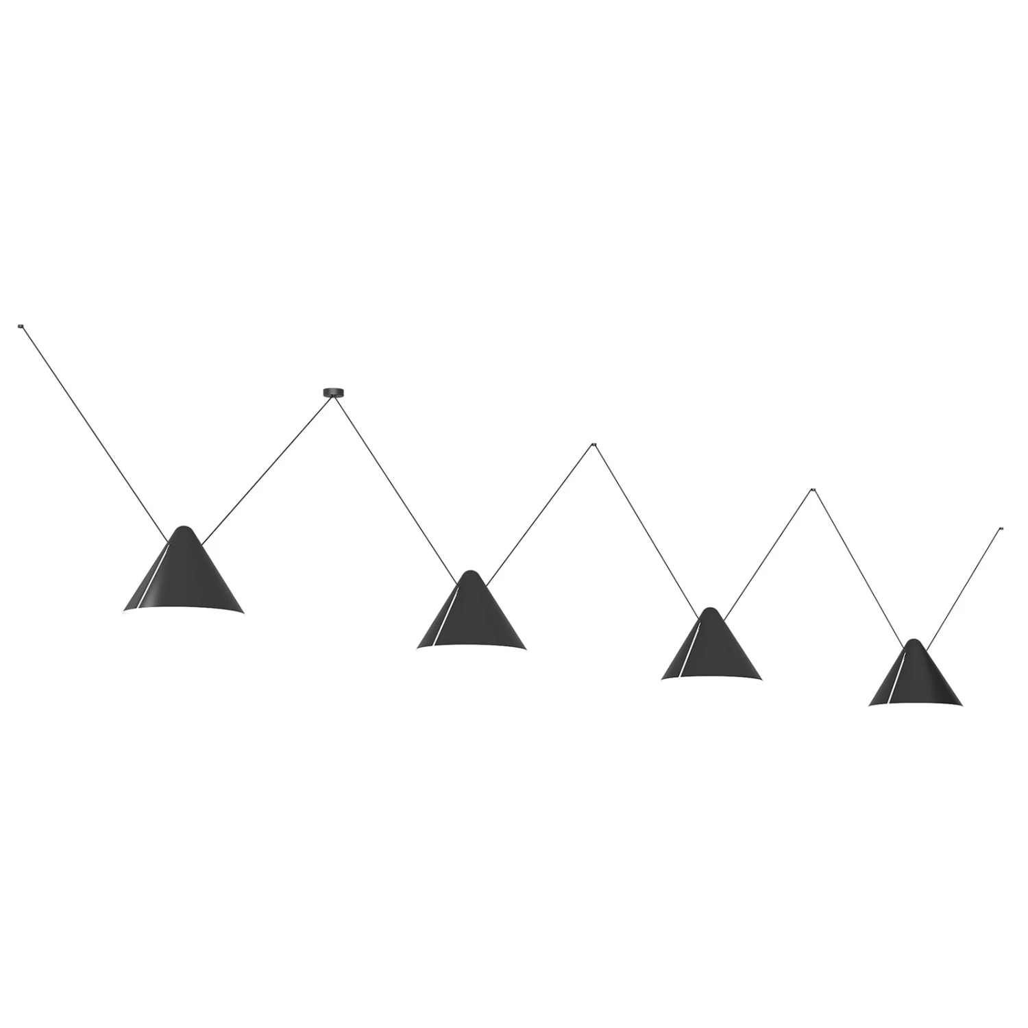 Als direkter Lichtspender für modern eingerichtete Wohn-, Geschäfts- und Aufenthaltsräume ist die Hängeleuchte Super Attic eine äußerst flexible Wahl. Die vier unten offenen Kegelschirme aus Aluminium sind außen schwarz und innen weiß lackiert. Sie sind entlang eines langen schwarzen Kabels angeordnet, wobei sich der Baldachin zwischen dem ersten und zweiten Schirm befindet und vier weitere Punkte zur Deckenbefestigung vorhanden sind, zwischen denen die Schirme in einer Reihe hängen. So lässt sich die Abpendelhöhe und Distanz der Schirme perfekt beispielsweise entsprechend der Länge eines Tischs oder Vitrine anpassen.