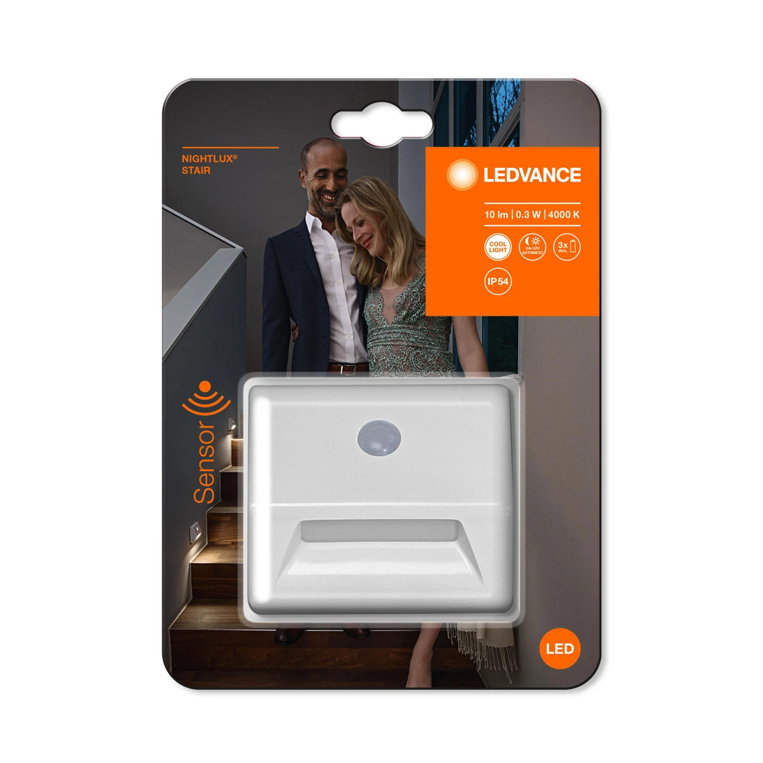 Mit der LED-Treppenleuchte Nightlux Stair kann man ideal dunkle Ecken im Treppenbereich erhellen. Die Leuchte ist so konzipiert, dass sie durch einen weißen Polycarbonatdiffusor das Licht nur nach unten und vor allem gleichmäßig gestreut abgibt. Der integrierte Sensor sorgt dafür, dass sie nicht permanent leuchtet, sondern nur, wenn er eine Bewegung wahrnimmt.