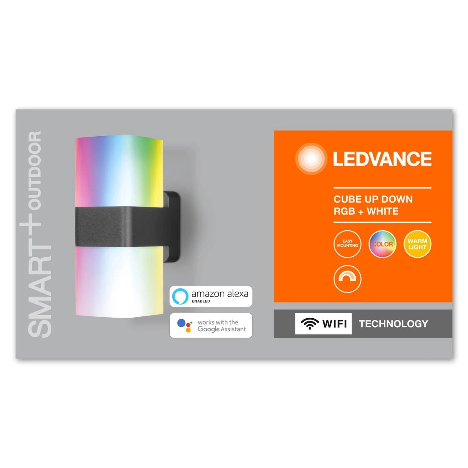 Als optisch ansprechender Akzent und funktionaler Lichtspender für mehr Sicherheit und eine bessere Orientierung überzeugt die LED-Außenwandleuchte Cube in modernen Grundstückgestaltungen. Der quaderförmige Diffusor aus opalem Polycarbonat, welcher mittig vom dunkelgrauen Aluminium-Wandhalter getragen wird, streut das Licht gleichmäßig. Bei Bedarf kann von warmweißem zu buntem Licht in beliebigem Ton gewechselt werden. Dies erfolgt wie die gesamt Steuerung per App oder Sprachbefehl. Hierzu genügen dank der LEDVANCE SMART+ WiFi-Technologie Smartphone/Tablet und WLAN.