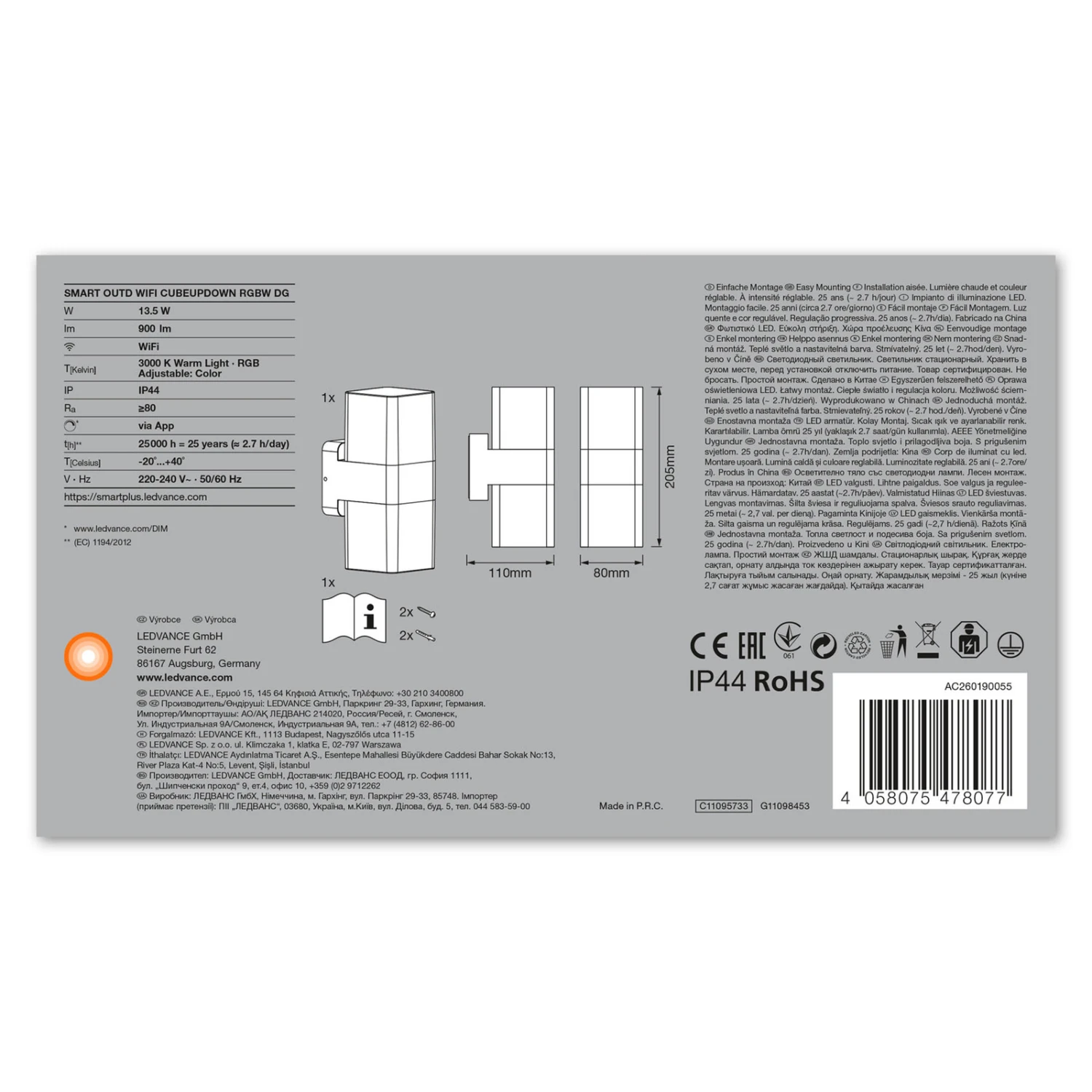 Moderne Up-and-Down-Außenwandleuchte Cube mit RGBW-LEDs und LEDVANCE SMART+ WiFi-Technologie