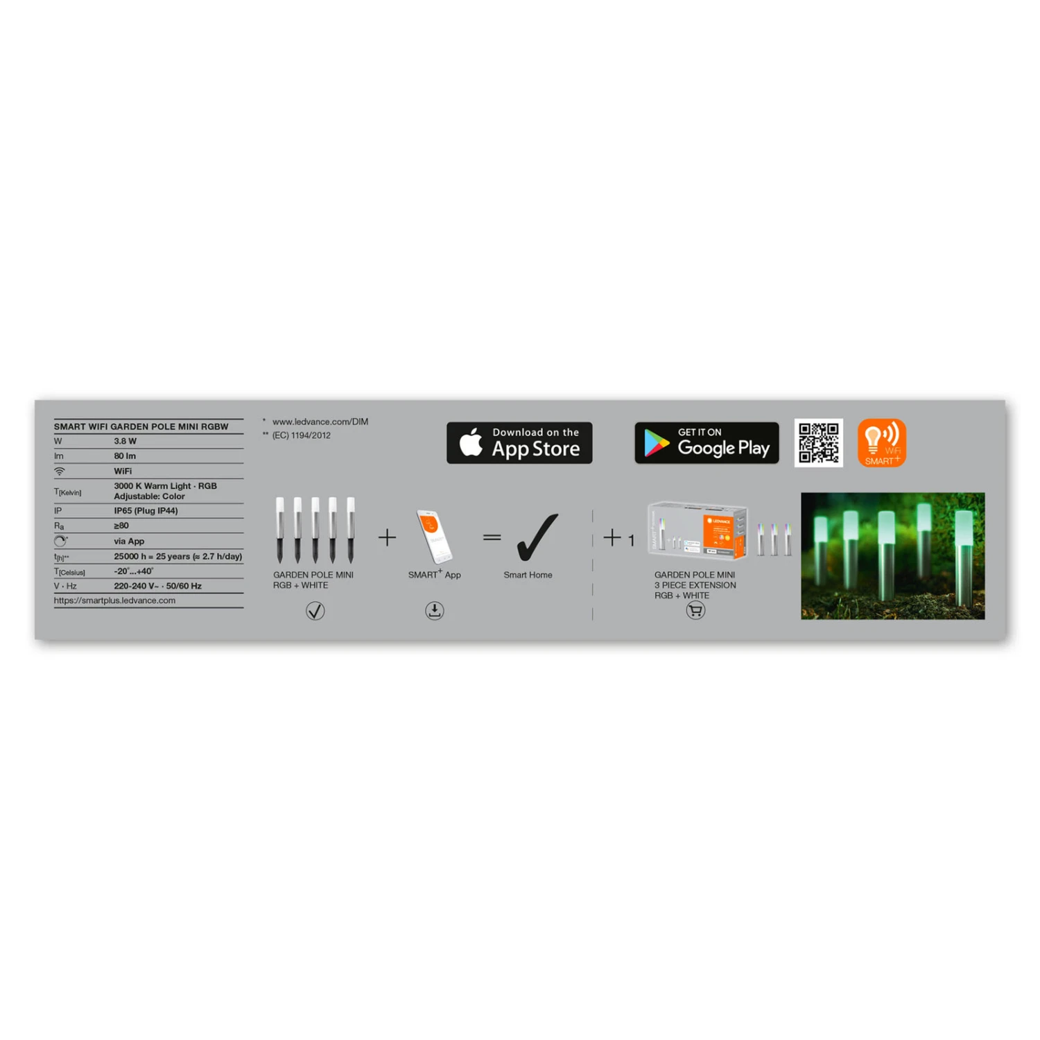 Die Erdspießleuchte Garden Pole in zylindrischer Form aus Edelstahl mit opalem Polycarbonat-Diffusor dient zur Lichtdekoration und Orientierungsbeleuchtung an Wegen, in Grünflächen und in Beeten. Im Lieferumfang sind fünf Leuchten, ein 230 V zu 5 V IP44-Steckertrafo, eine Controllerbox (LEDVANCE SMART+ WiFi Funkmodul zur Koppelung der Leuchten mit dem Tablet/Smartphone über das WLAN) und die notwendige Verkabelung enthalten. Per App oder Sprachbefehl kann die Lichtfarbe von Warmweiß zu einem beliebigen bunten Ton gewechselt werden. Bei Bedarf lässt sich die Gruppe mit dem 3er-Erweiterungsset (siehe Zubehör) auf acht Leuchten vergrößern.