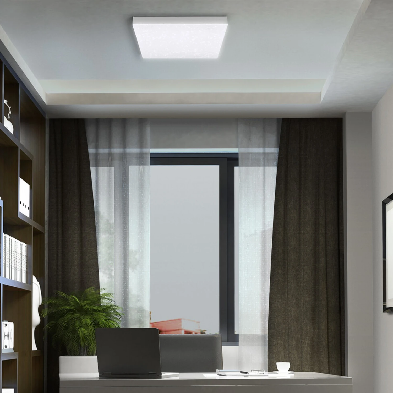 Die flache, eckige LED-Deckenleuchte Planon FL Sparkle lässt sich dank WiFi-Technolgie smart steuern, und zwar nach WLAN-Einbindung per Tablet oder Smartphone mit der für Android- und iOS-Geräte kostenlos verfügbaren LEDVANCE SMART+ WiFi App. Auch eine Steuerung per Sprache mit Google Assistant oder Amazon Alexa ist möglich. Das Panel ist rahmenlos gestaltet und mit einer Abdeckung aus Kunststoff versehen, die dank des Sparkle-Effekts für einen funkelnden Sternenhimmeleffekt im Raum sorgt. Helligkeit und Farbtemperatur sind passend zur jeweiligen Situation regelbar. Das LED-Panel ist einfach und schnell installiert, das komplette Montagematerial wird mitgeliefert.