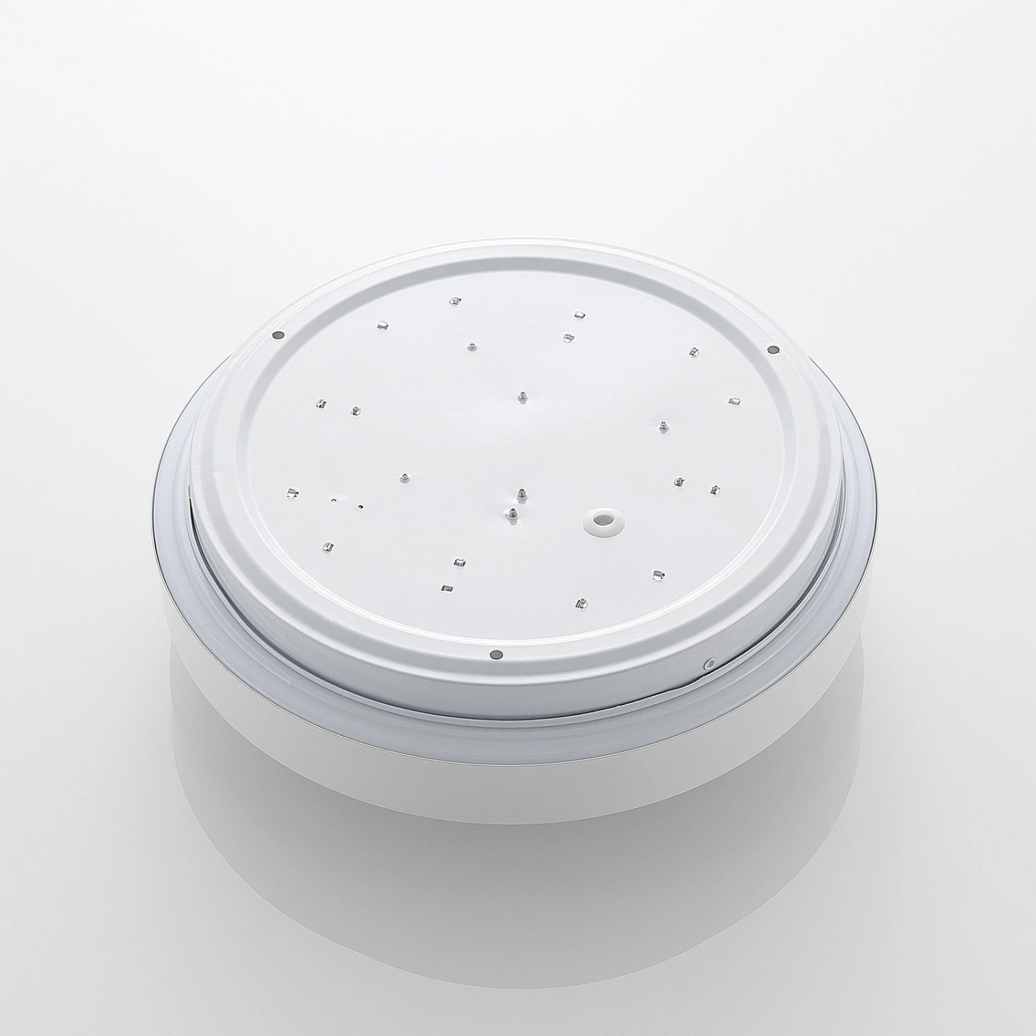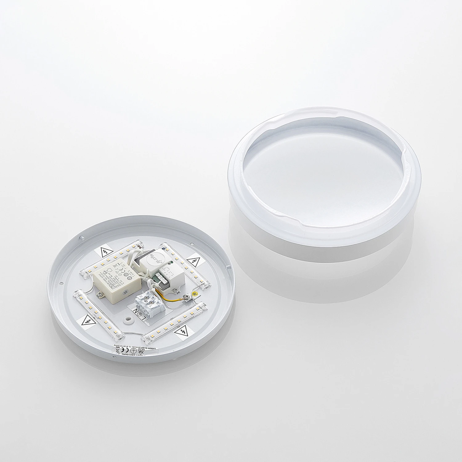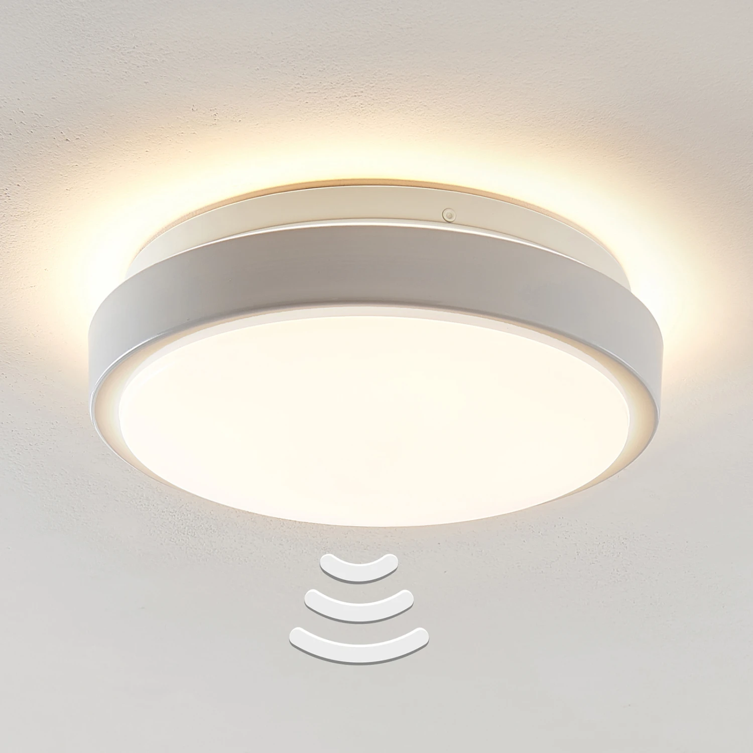 Schlichte Bewegungsmelder-LED-Deckenleuchte Camille mit weißem Rahmen und runder Form