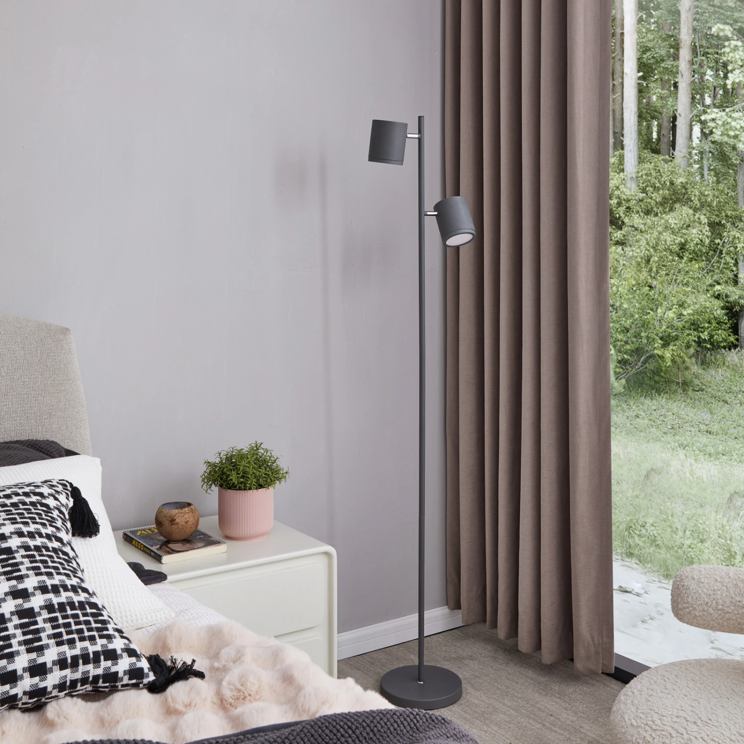 Zweiflammige LED-Stehleuchte Emelja mit grauem Finish und wechselbarer Lichtfarbe