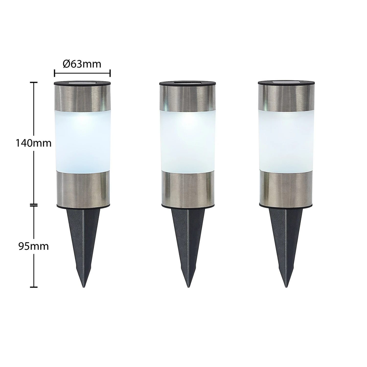 Kompakter LED-Solar-Erdspieß Jocob im 3er-Set aus Edelstahl und Kunststoff Jocob überzeugt durch sein schlichtes Design und kommt in einem praktischen 3er-Set. Die Solarleuchten sind aus Edelstahl und Kunststoff gefertigt und erscheinen in einem stimmigen Farbkontrast. Jede Leuchte wird mit Solarlicht betrieben und sind die Akkus voll aufgeladen, so spenden sie bis zu acht Stunden Licht für den Außenbereich. Die Schutzart IP44 macht sie geschützt gegen Spritzwasser und somit wie geschaffen für den Garten. Die LED-Solar-Erdspieße Jocob verfügen über festverbaute LEDs, welche ein kühles Licht erzeugen. Ihr eher unauffälliges Äußeres integriert sich mühelos in die Garteneinrichtung und den Baustil eines Hauses, mit dem Erdspieß können sie fest im Boden verankert werden.