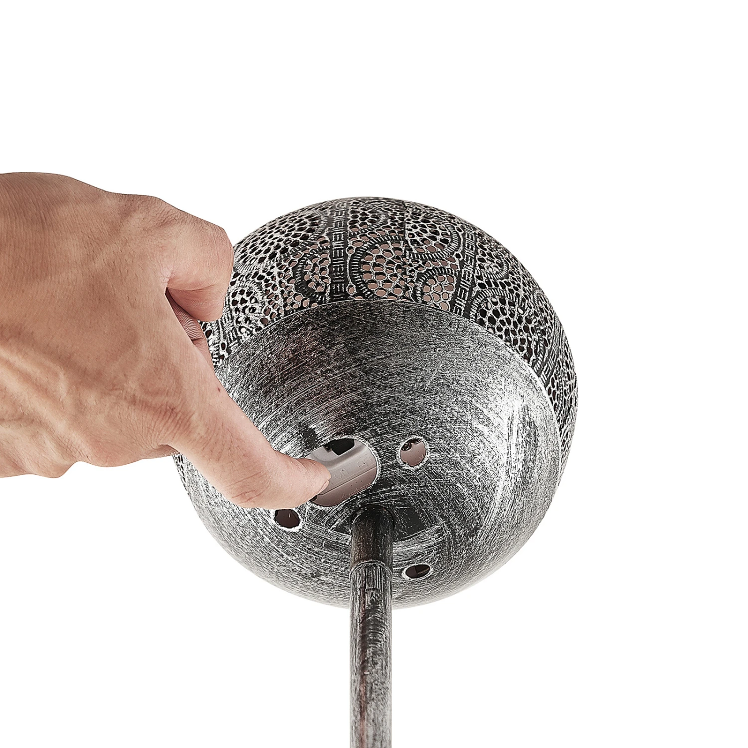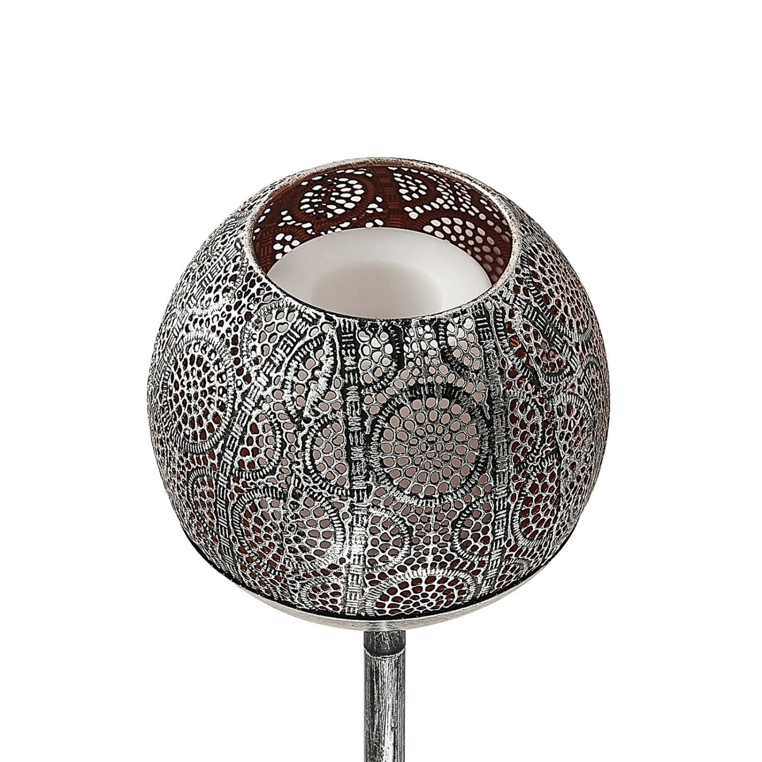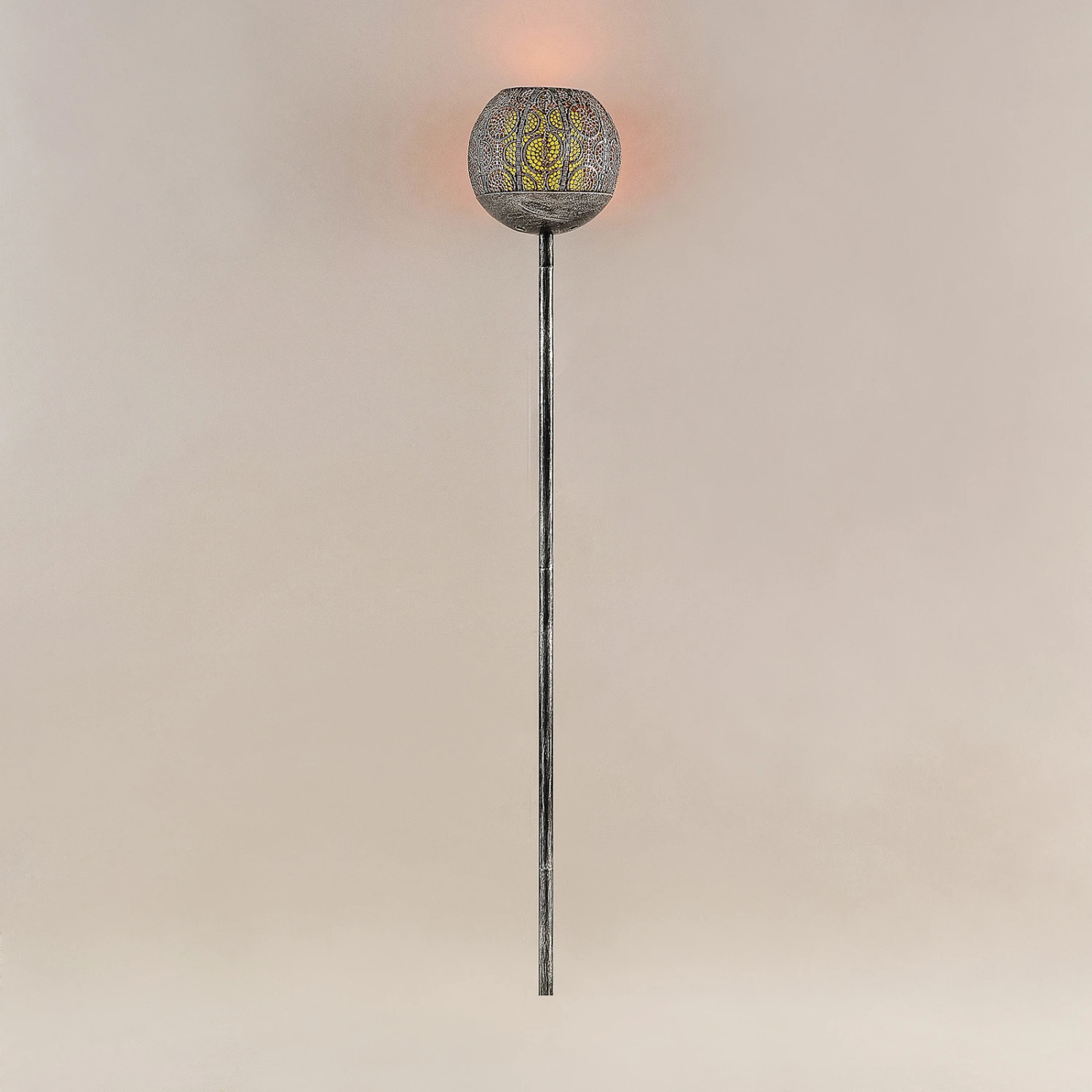 Miliana überzeugt mit einer orientalischen Note, denn das Stanzmuster auf dem kugelförmigen Lampenschirm sieht sehr kunstvoll aus und lässt ein Spiel aus Licht und Schatten entstehen, das für weit mehr steht als bloßen Lichtschein, sondern auch eine dekorative Wirkung entfaltet und dafür sorgt, dass man sich draußen besonders wohlfühlt an einem lauen Sommerabend mit Freunden oder der Familie. Die Außenseite der Eisenkugel ist in gebürstetem Silber gehalten, innen sieht man einen Kupfergoldton durchschimmern, der das Licht warm und gemütlich reflektiert. Der Akku sorgt für max. 6 Stunden Leuchtzeit, wenn die Sonne ihn vollständig geladen hat. Die Verankerung erfolgt über einen Erdspieß, so dass sicherer und fester Halt im Boden gewährleistet werden kann.