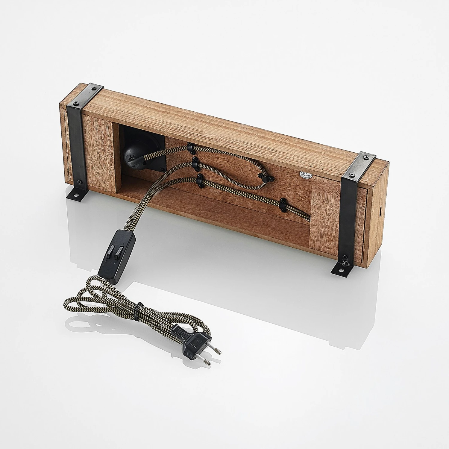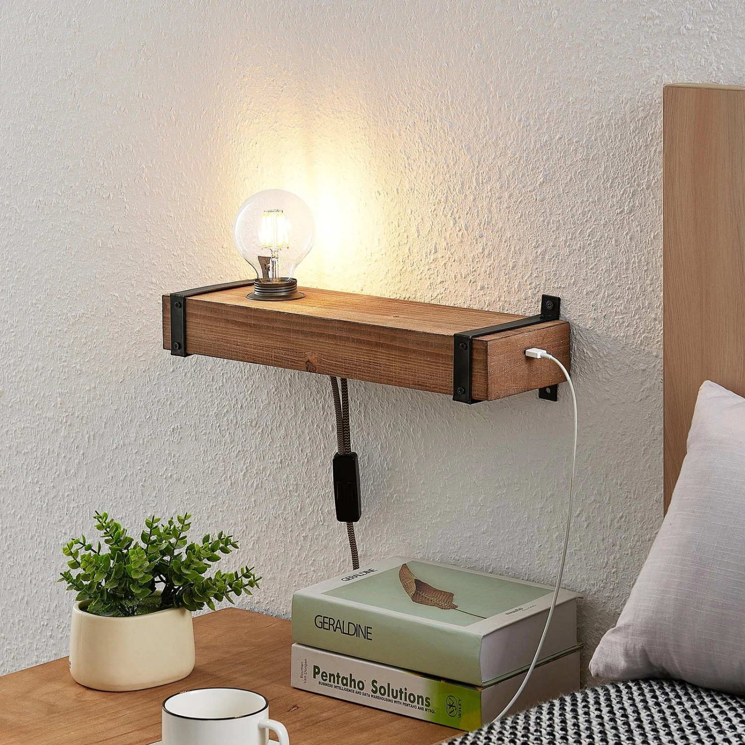 Wandleuchte Sverina aus Holz mit Kabel und Stecker und USB-Anschluss