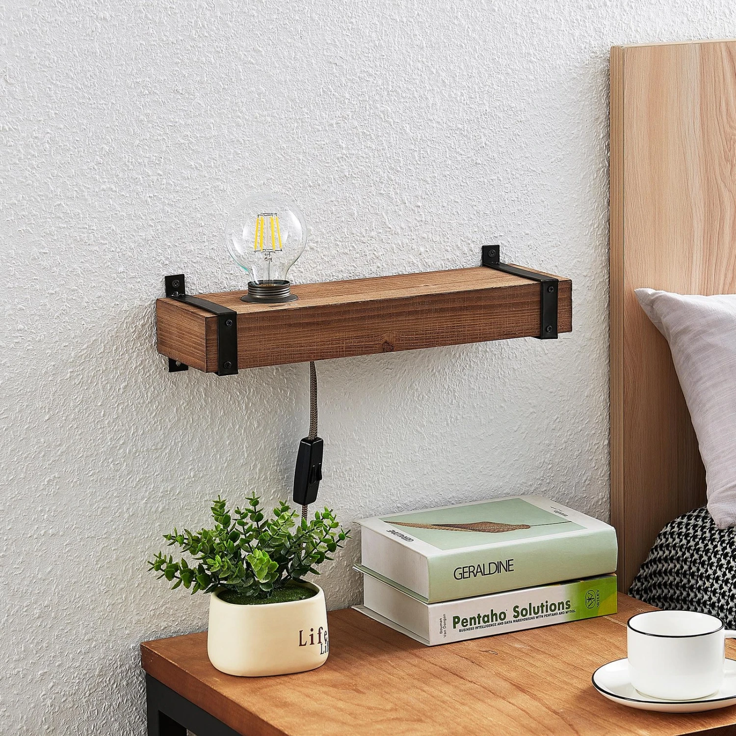 Die aus Holz in der Machart eines Regales gefertigte Wandleuchte Sverina ist ideal für den Einsatz als Nachttischleuchten-Ersatz. An der Wand oberhalb oder seitlich vom Bett angebracht, lässt sie sich bequem durch den am Zuleitungskabel integrierten Schalter ein- und ausschalten. Die Wandleuchte ist mit einer nach oben gerichteten E27-Fasung ausgestattet und zudem an der Seite mit einem USB-Anschluss ausgestattet, so dass hier das Smartphone über Nacht abgelegt und aufgeladen werden kann. Die Wandleuchte wird von zwei schmalen, schwarz lackierten Metallbändern an den Seiten umschlossen, mit denen sie auch befestigt wird.