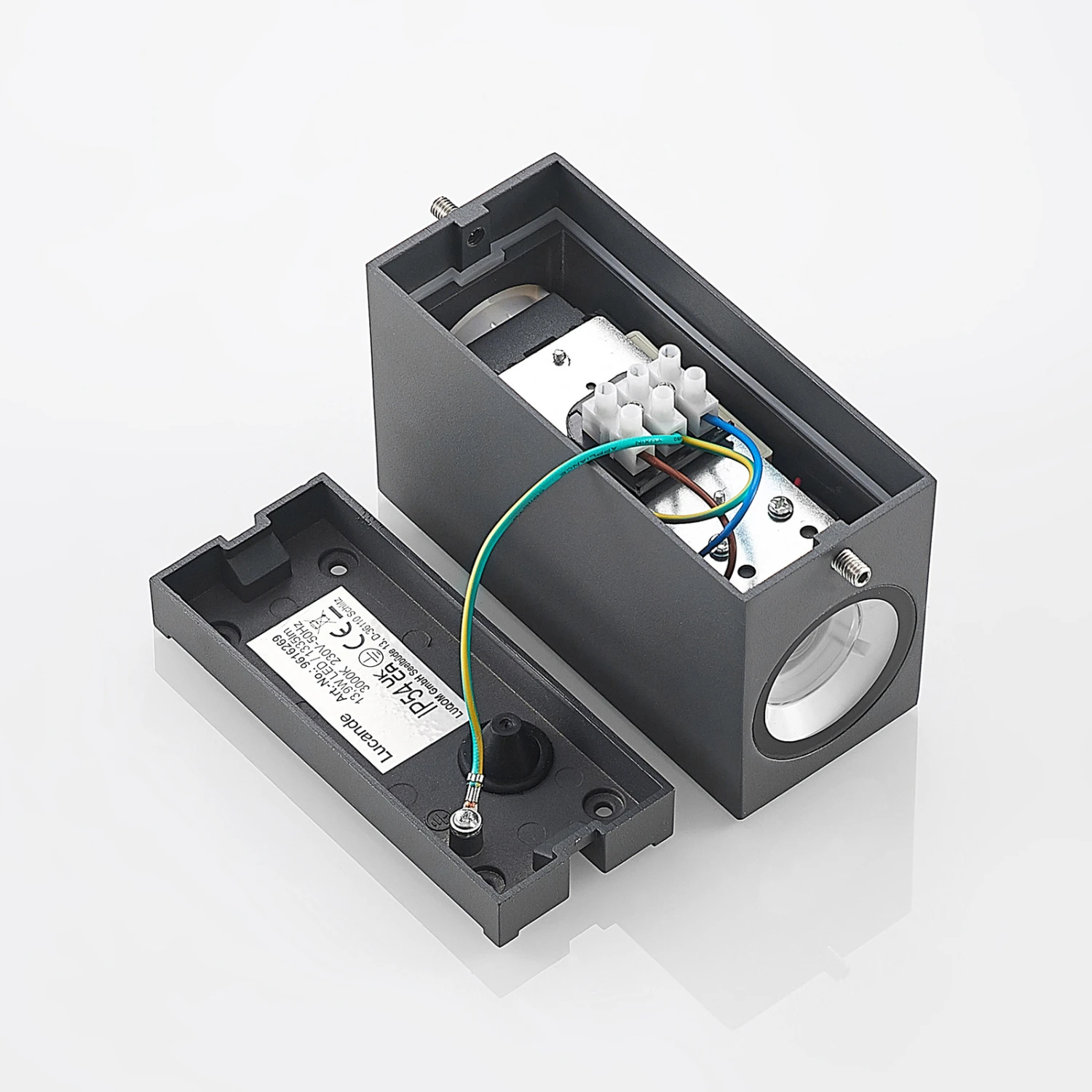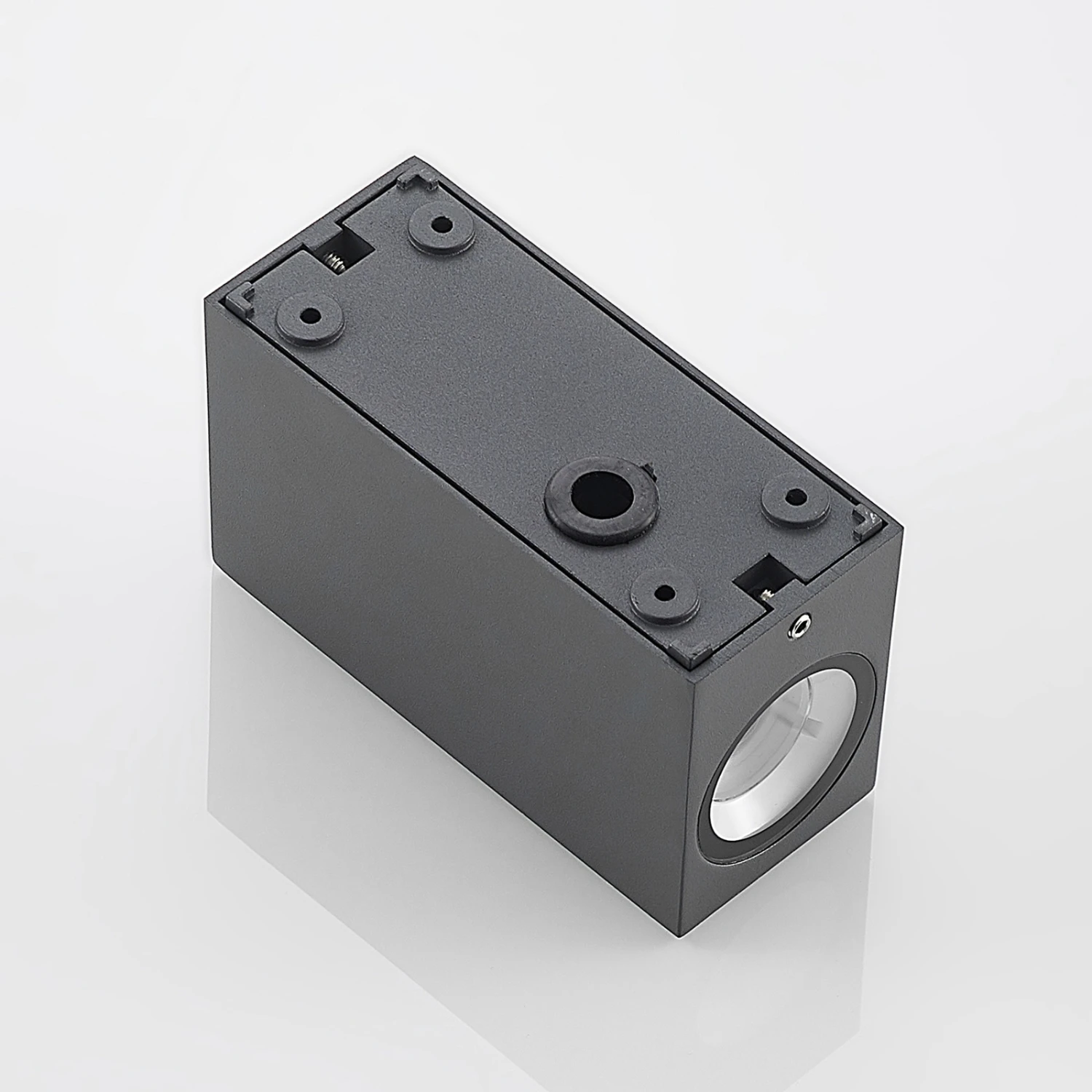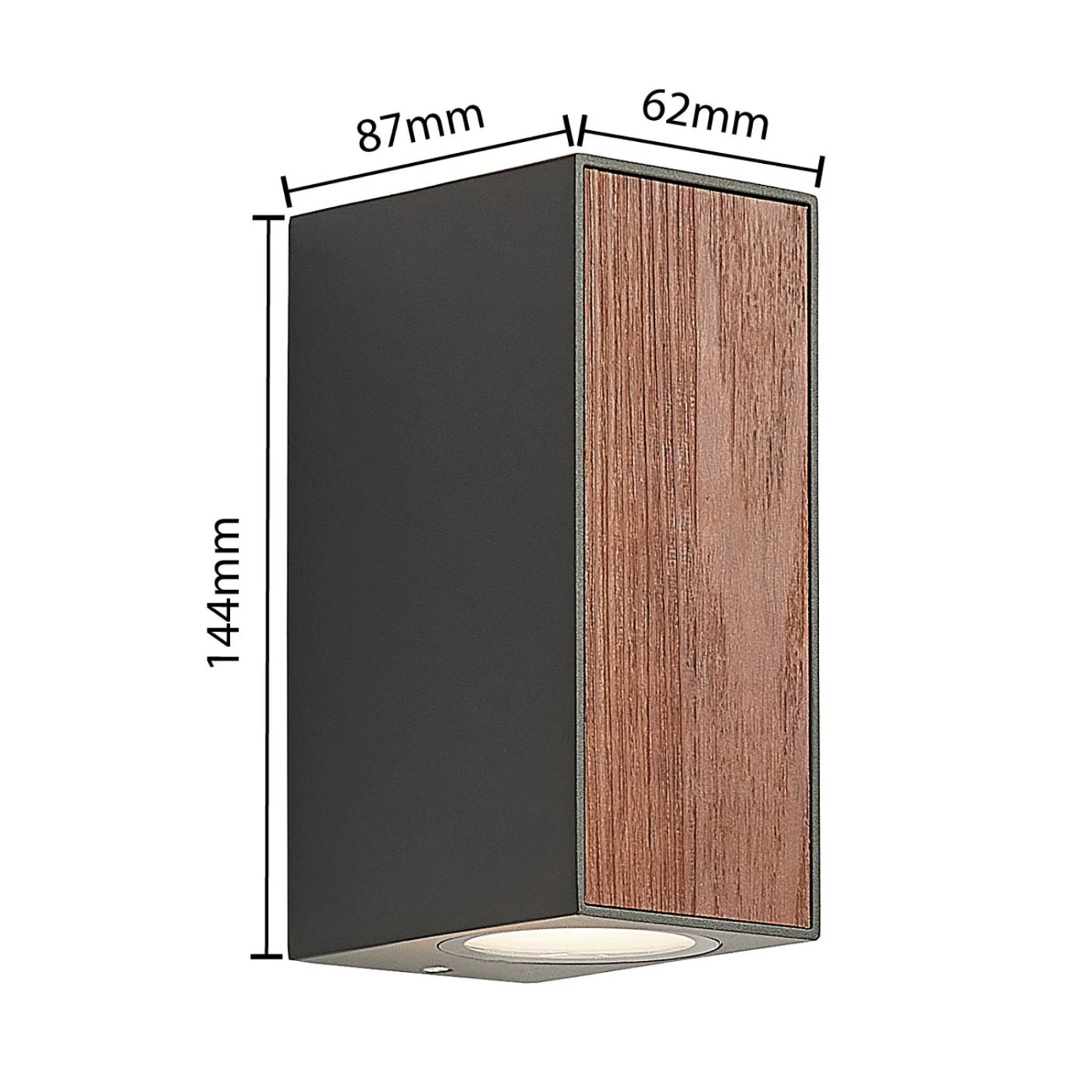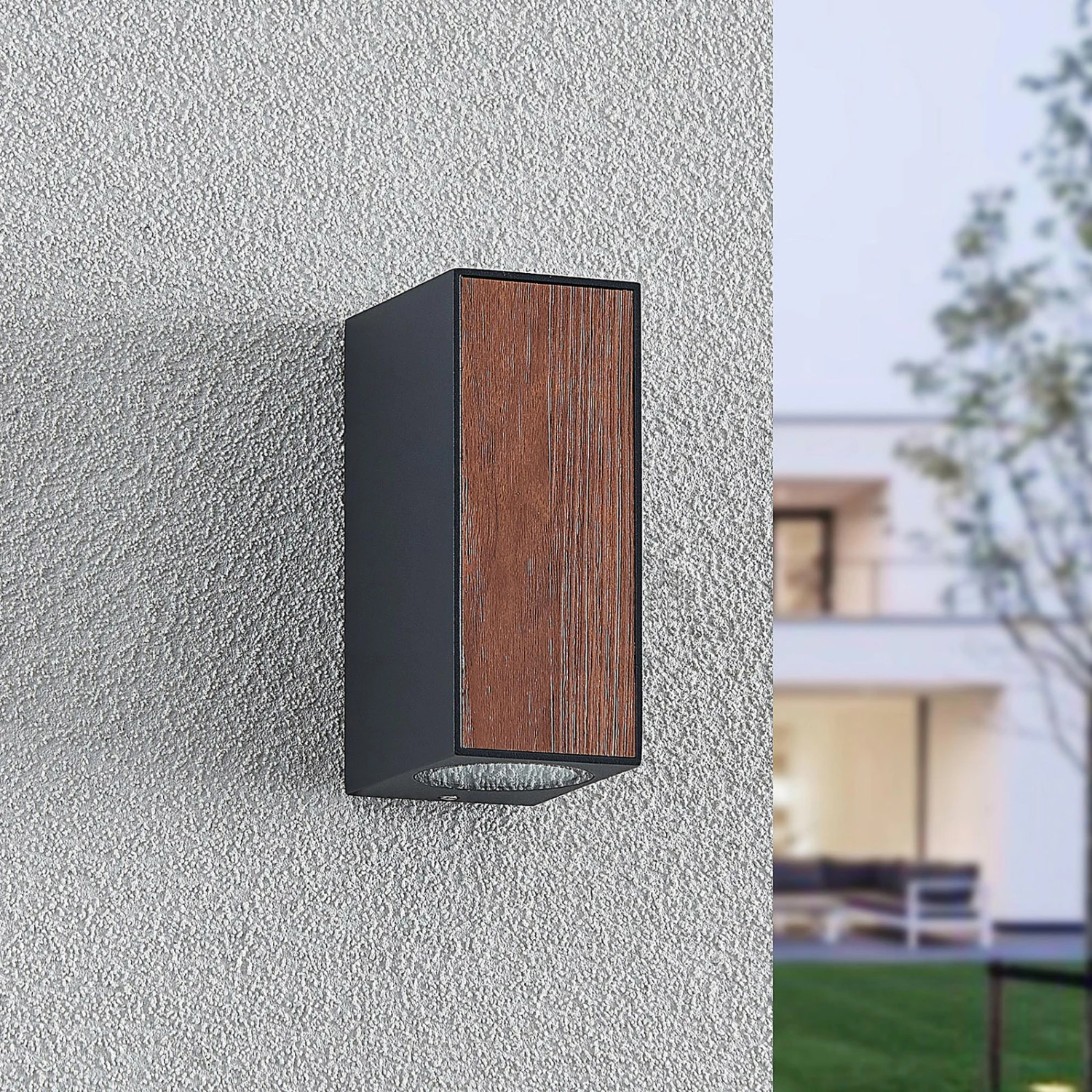 Länglich geformt aus Aluminiumdruckguss in dunklem Grau und an den Seiten und frontal mit warmtönigem Holz dekoriert, stellt die LED-Außenwandleuchte Cimala eine Leuchte dar, die hervorragend an modern gestaltete Bauten passt und hier besonders dekorativ wirkt, wenn mehrere Exemplare an der Fassade montiert werden. Nach oben und unten wurden im Korpus hinter satinierten Abdeckungen aus Glas warmweiße LEDs verbaut, so dass schöne Lichtkegel an der Fassade entstehen.
