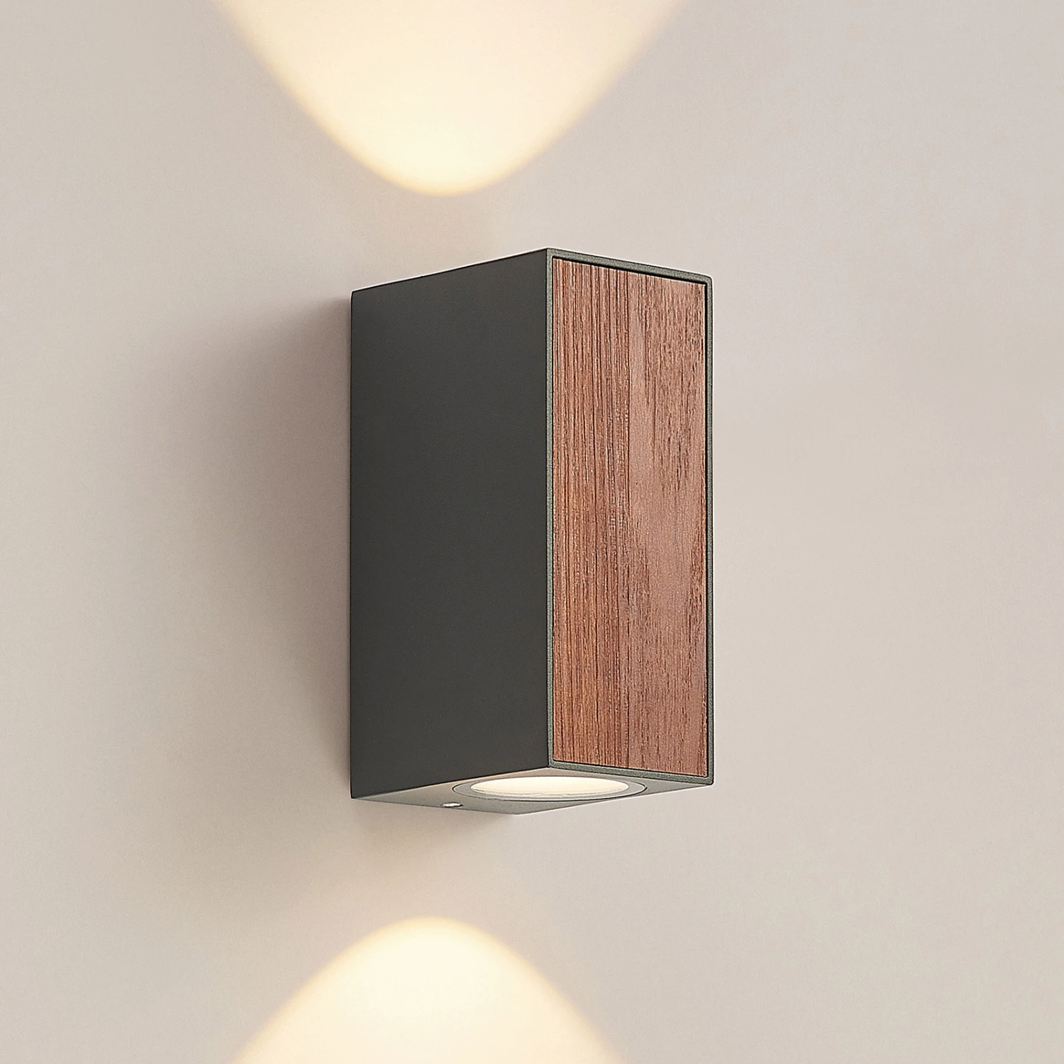 LED-Außenwandleuchte Cimala in länglicher Form mit Holzdekor, up & down